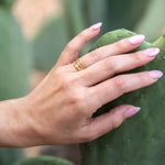 An expression of desert beauty, the 14k Gold Slender Band Cactus Ring showcases an organic narrow band handcrafted with a cactus fiber pattern. The ring is comfortable and low profile, making it perfect for everyday. This narrow ring showcases the simplicity and elegance of a cactus, making it a unique and versatile everyday accessory. Wear it as a reminder of the beauty and resilience of the desert.