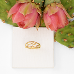 This narrow gold cactus ring is made using actual Prickly Pear cactus skeletons (skeleton closeup shown). Using the lost wax casting process, each piece is a solid metal replica of a section of cactus skeleton.