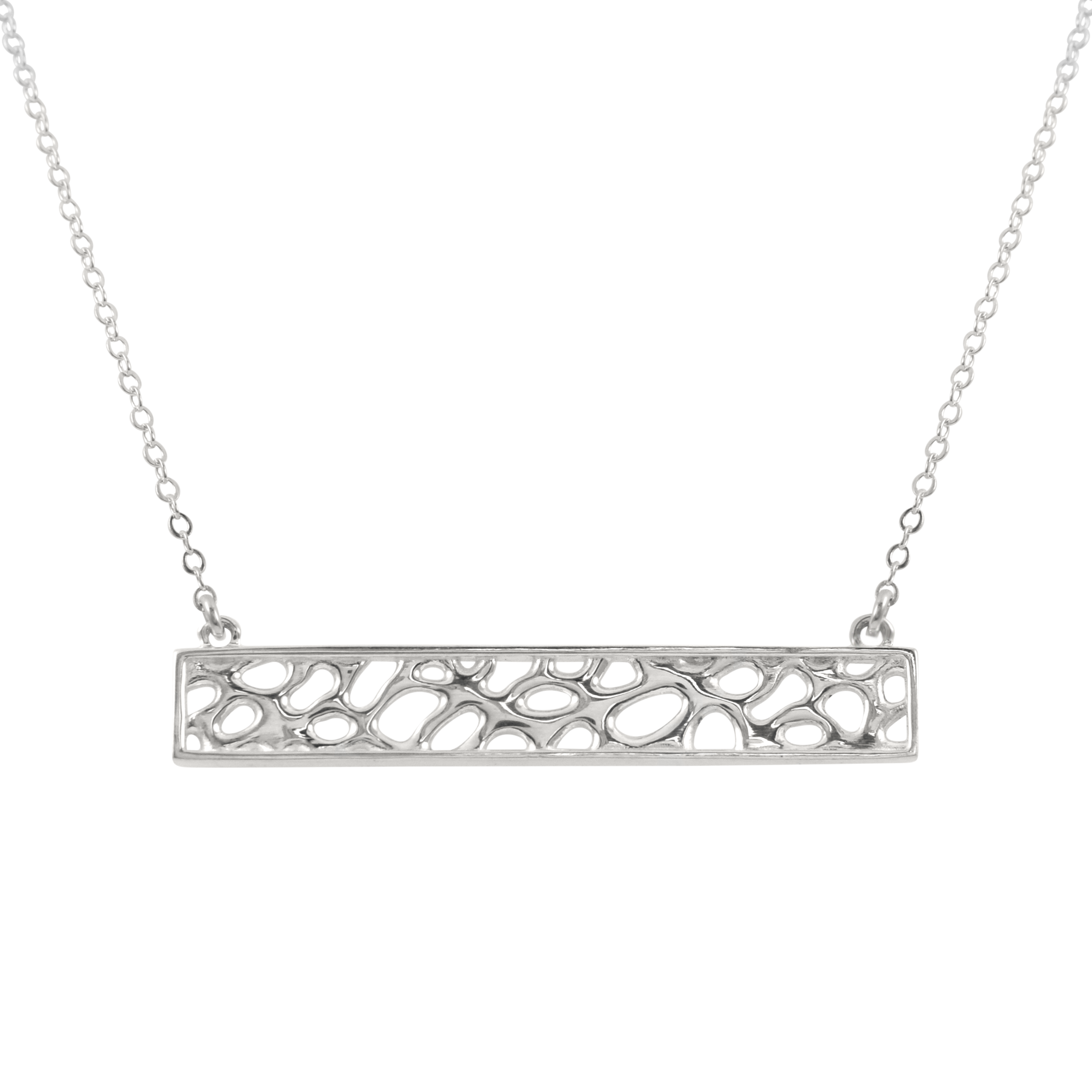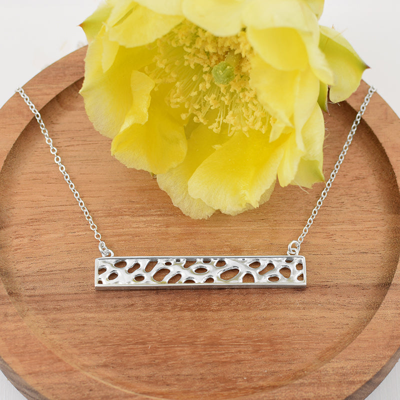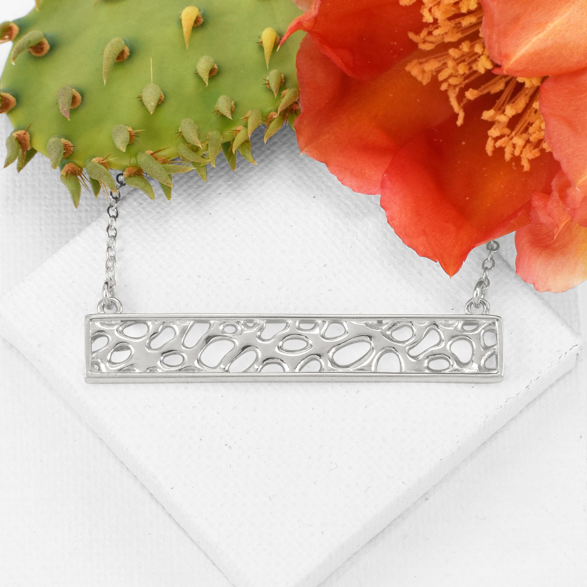 This sleek bar cactus necklace features a unique desert design and is made using the pattern of prickly pear cactus fiber. Its minimalist aesthetic makes it the perfect botanical necklace for the modern desert lover.