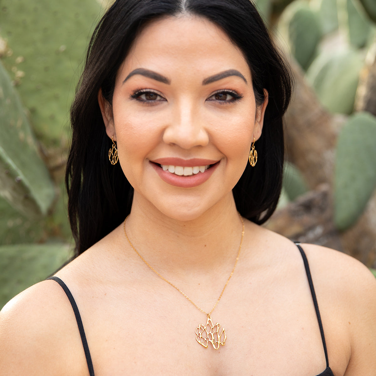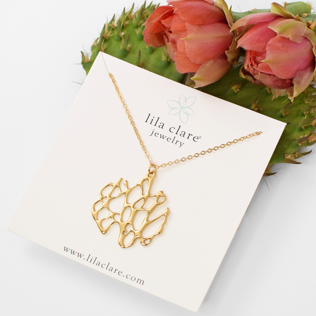 This handmade gold cactus pendant is made using actual Prickly Pear cactus skeletons (skeleton closeup shown). Using the lost wax casting process, each piece is a solid metal replica of a section of cactus skeleton.
