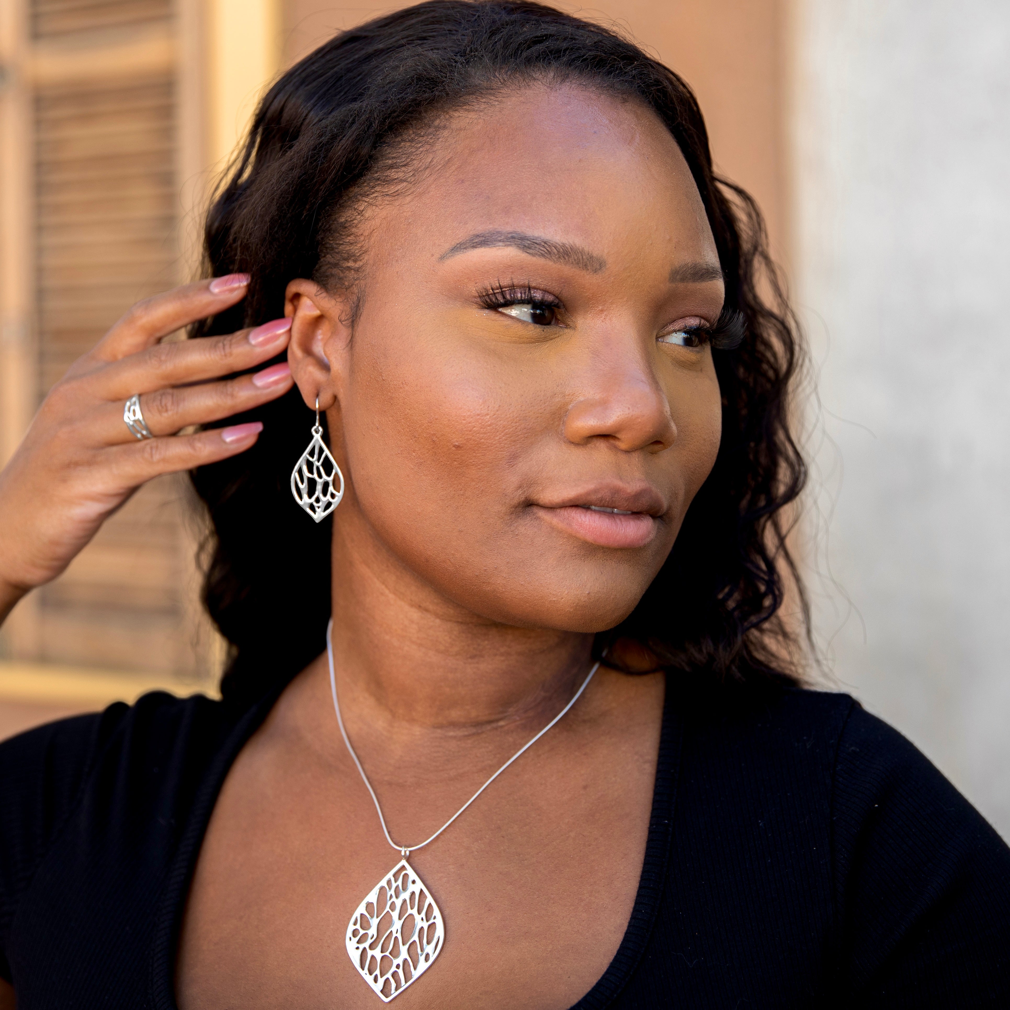 These handmade cactus fiber earrings are an modern interpretation of my prickly pear cactus jewelry. The framed pointed teardrop shape is inspired by Moroccan arabesque tile, and the cactus pattern really pops in these silver desert earrings.