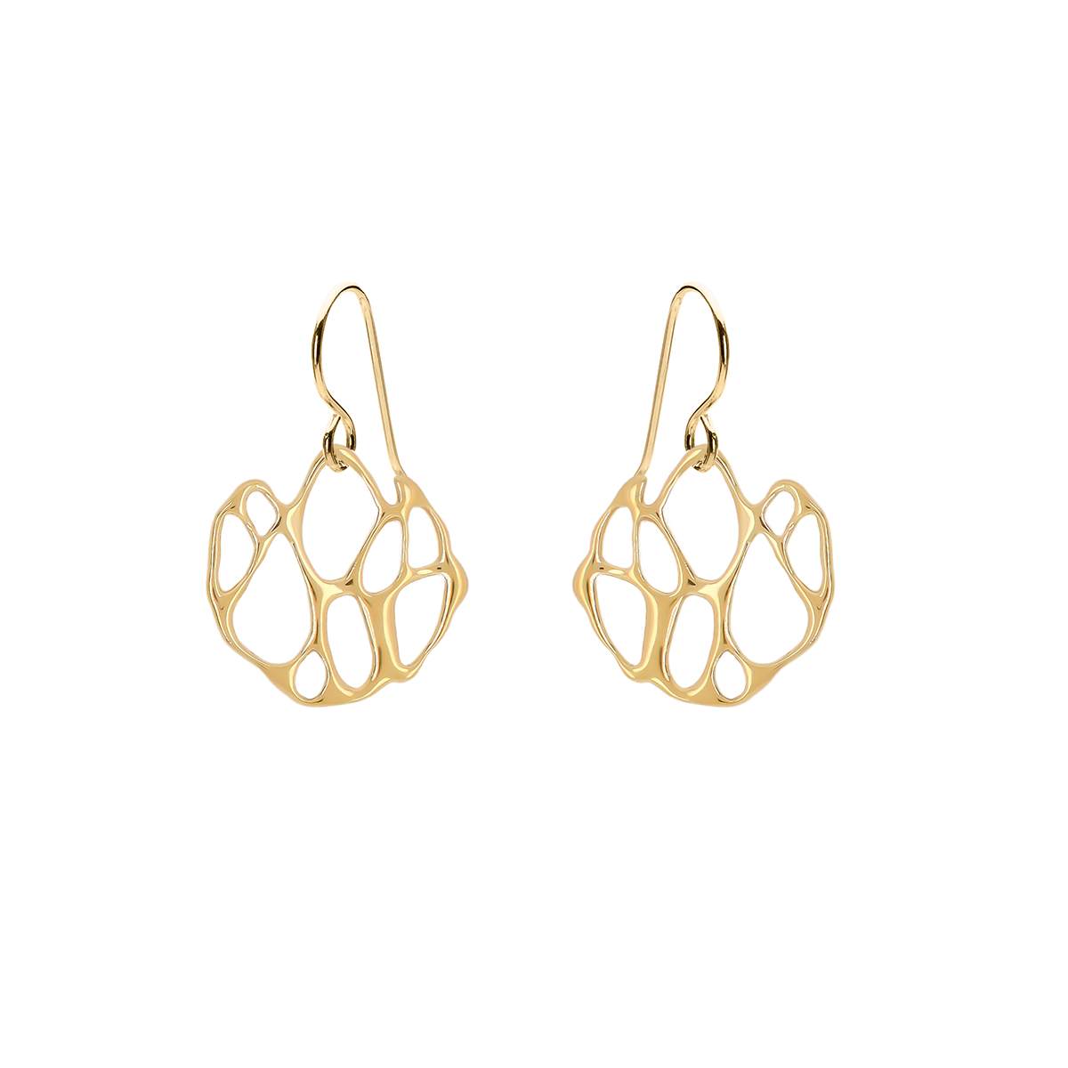 These gold cactus earrings are made using actual Prickly Pear cactus skeletons (skeleton closeup shown). Using the lost wax casting process, each piece is a solid metal replica of a section of cactus skeleton.