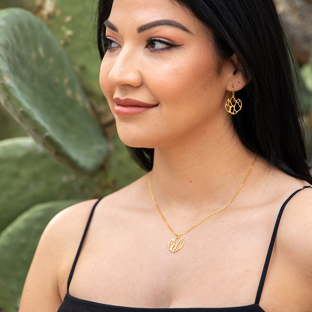 These small organic circle cactus earrings capture the warmth and elegance of the desert in 14k gold. Handcrafted from the delicate skeleton of the prickly pear cactus, each piece features soft, freeform edges that reflect the natural texture of the cactus fiber. Lightweight with a golden glow, they add a refined yet earthy touch to your everyday style.