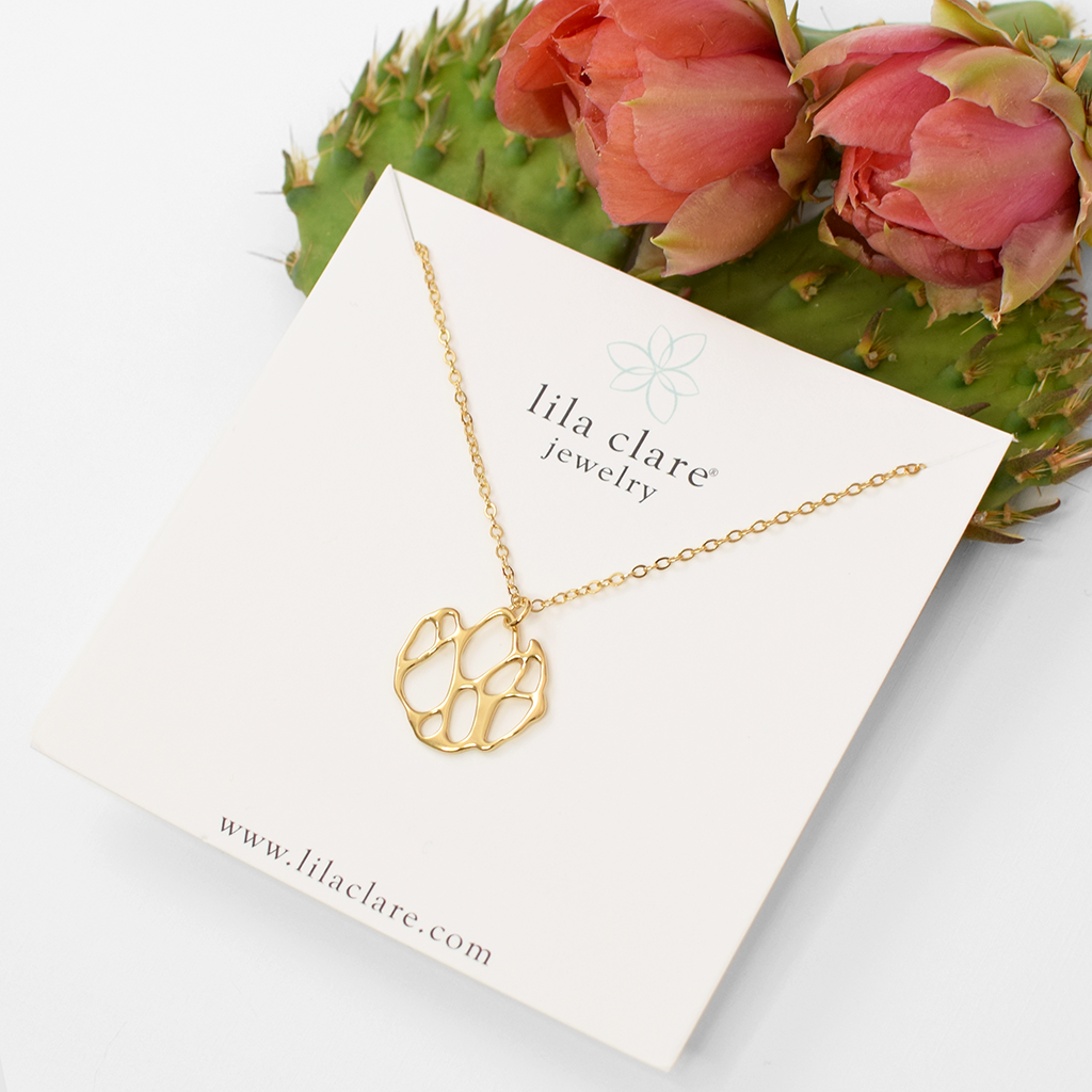 Capture the spirit of the desert with this small organic circle cactus necklace in solid 14k gold. Formed from the intricate pattern of prickly pear cactus fiber, the pendant’s soft, flowing edges highlight its natural origins. Handcrafted and full of character, this warm, nature-inspired necklace is a subtle, meaningful piece you’ll reach for again and again.
