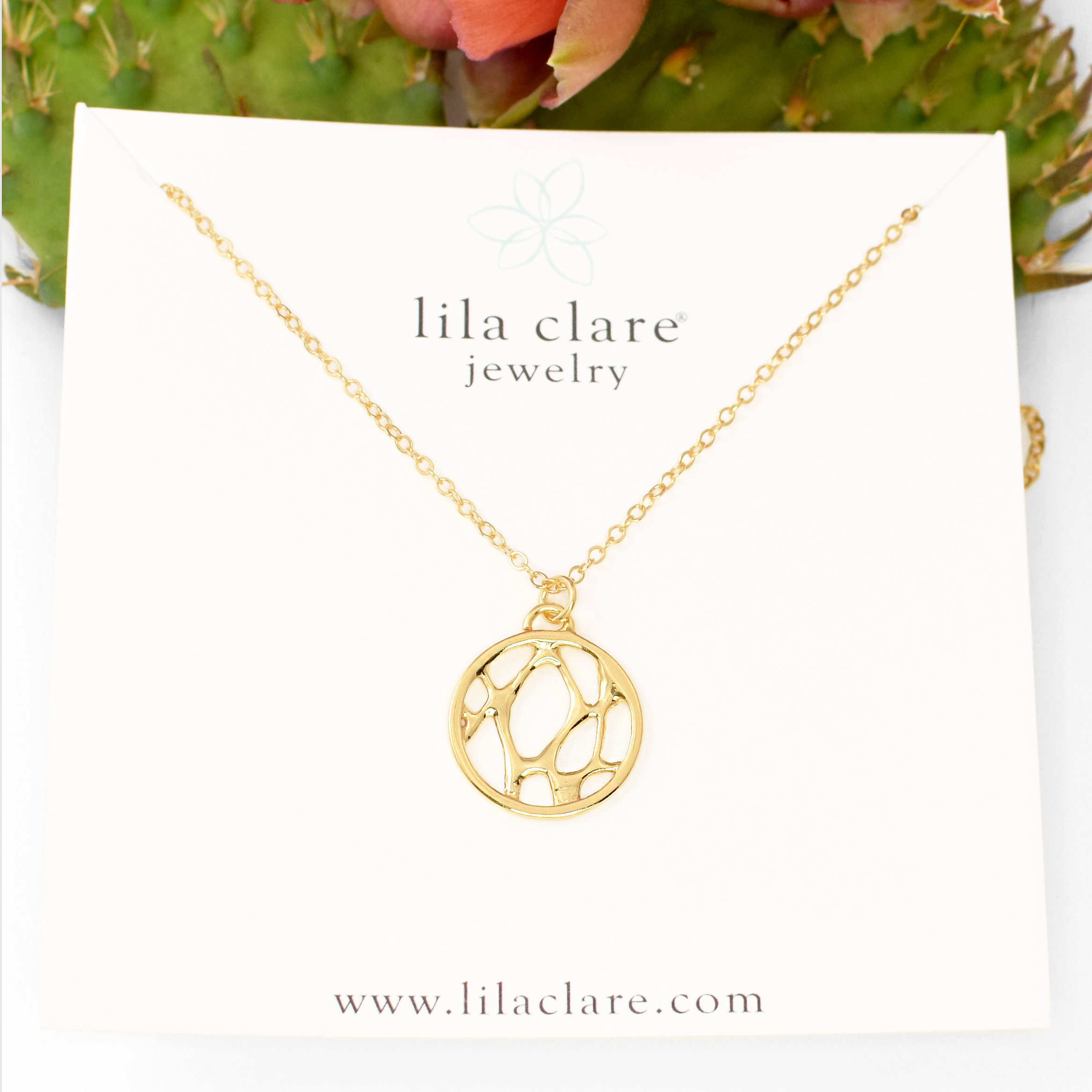 Wear a symbol of the desert with the Small Gold Framed Circle Cactus Necklace. Featuring a circle pendant charm with prickly pear cactus fiber pattern, this gold necklace is a perfect remembrance of the Southwest.
