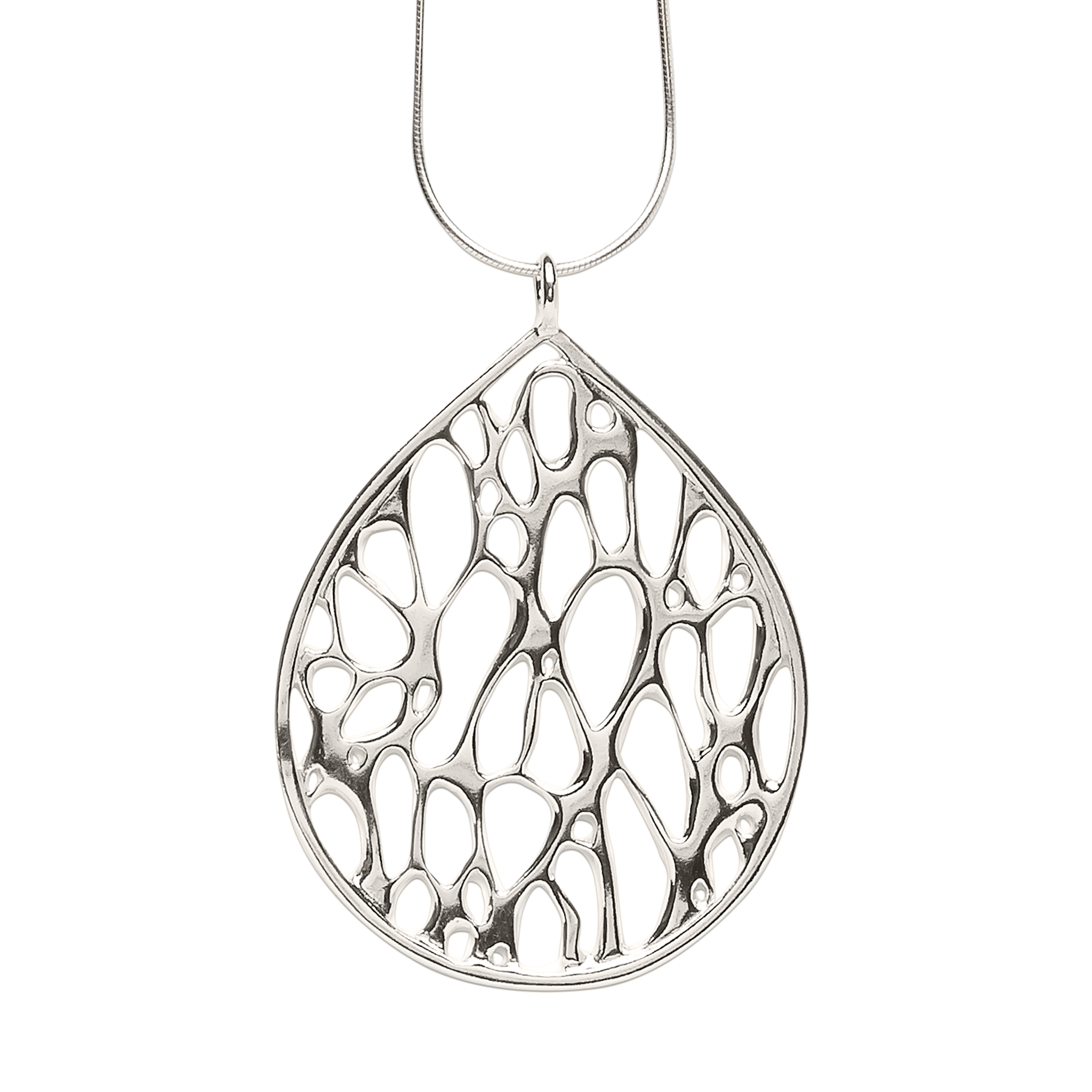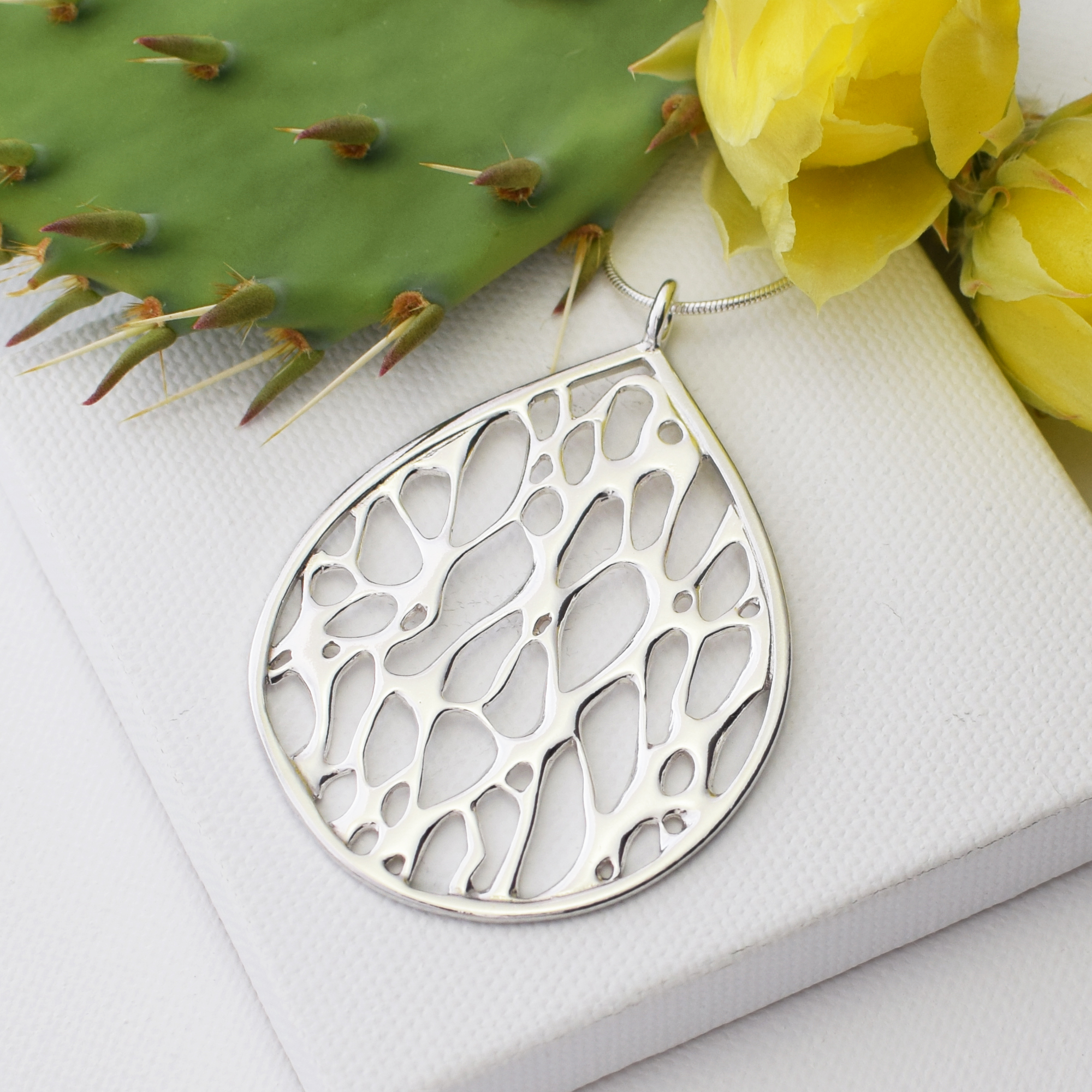 This handmade teardrop cactus pendant is made from actual Prickly Pear cactus skeletons (skeleton closeup shown). Using the lost wax casting process, each piece starts with a carefully selected section of Prickly Pear cactus skeleton.