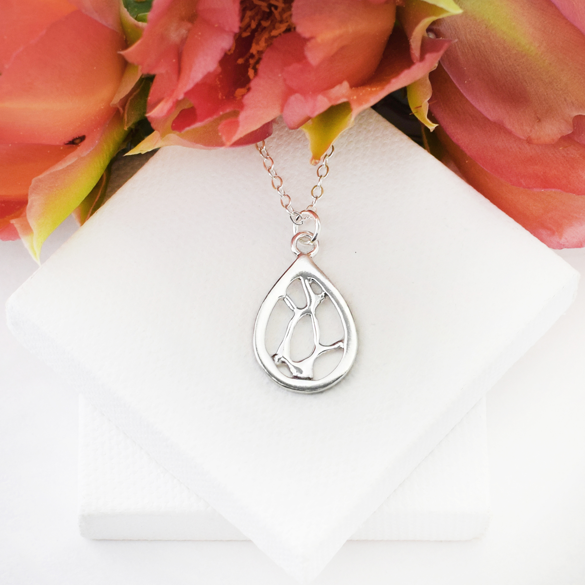 This classic sterling silver Small Teardrop Cactus Necklace captures the quiet beauty of the desert in a refined, everyday design. Made from a cast of prickly pear cactus fiber, the organic texture is set within a teardrop shape that’s both subtle and eye-catching. Lightweight and versatile, it’s a nature-inspired piece you’ll reach for again and again.