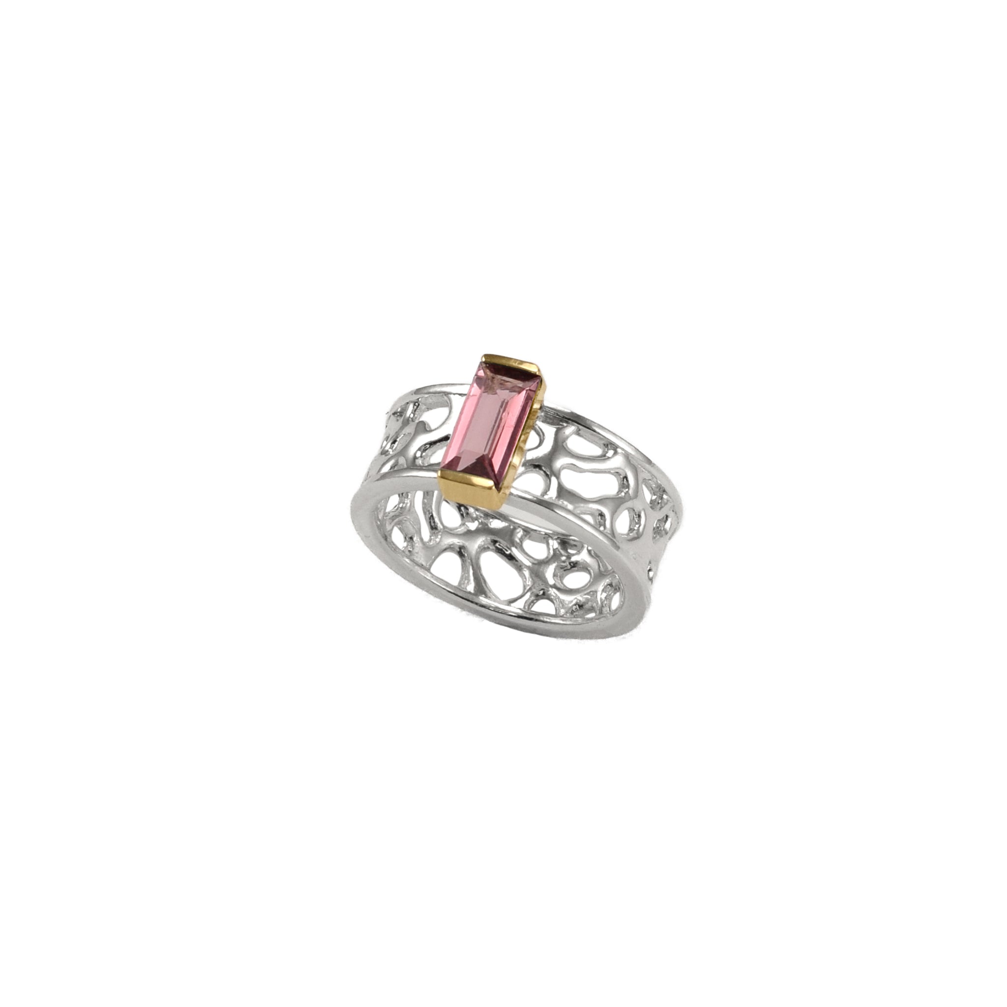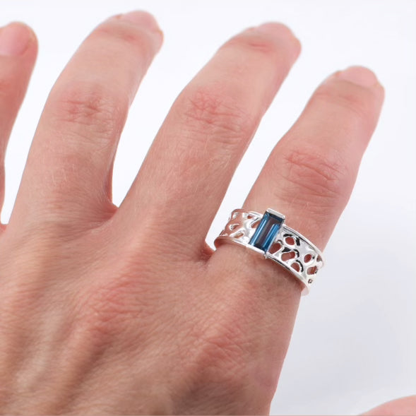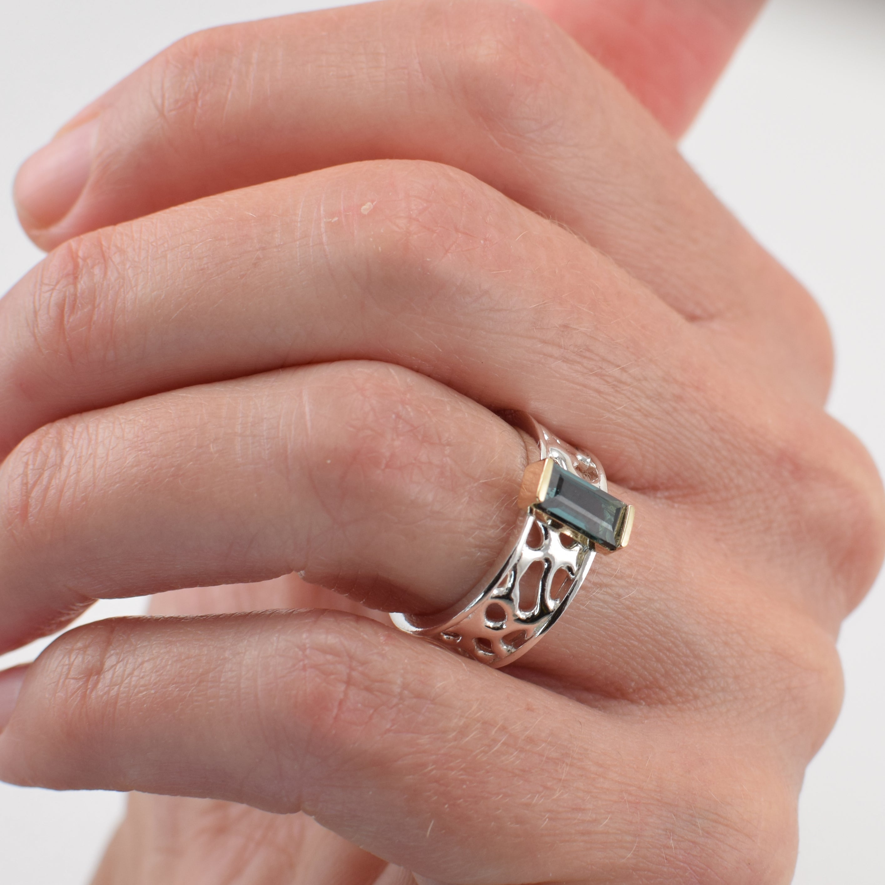 We chose the Silver Medium Band Cactus Ring with Tourmaline Baguette Gemstone. The color of the Tourmaline gemstone is eye-catching. Not your usual gemstone. When added to the beautiful prickly pear cactus ring design, the result is stunning.
