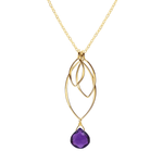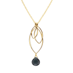 This handcrafted necklace features three dangling 14k Gold Vermeil leaves; a faceted semi-precious gemstone is suspended from the center largest leaf. Model wears the silver version of the necklace.