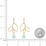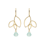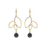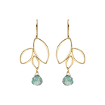 Dangle three leaf earrings are inspired by leaf clusters at the end of a branch. These handmade gold leaf earrings feature three 14k Gold Vermeil leaves soldered in place with dangling semi-precious gemstones. Model wears the silver version of the earrings.