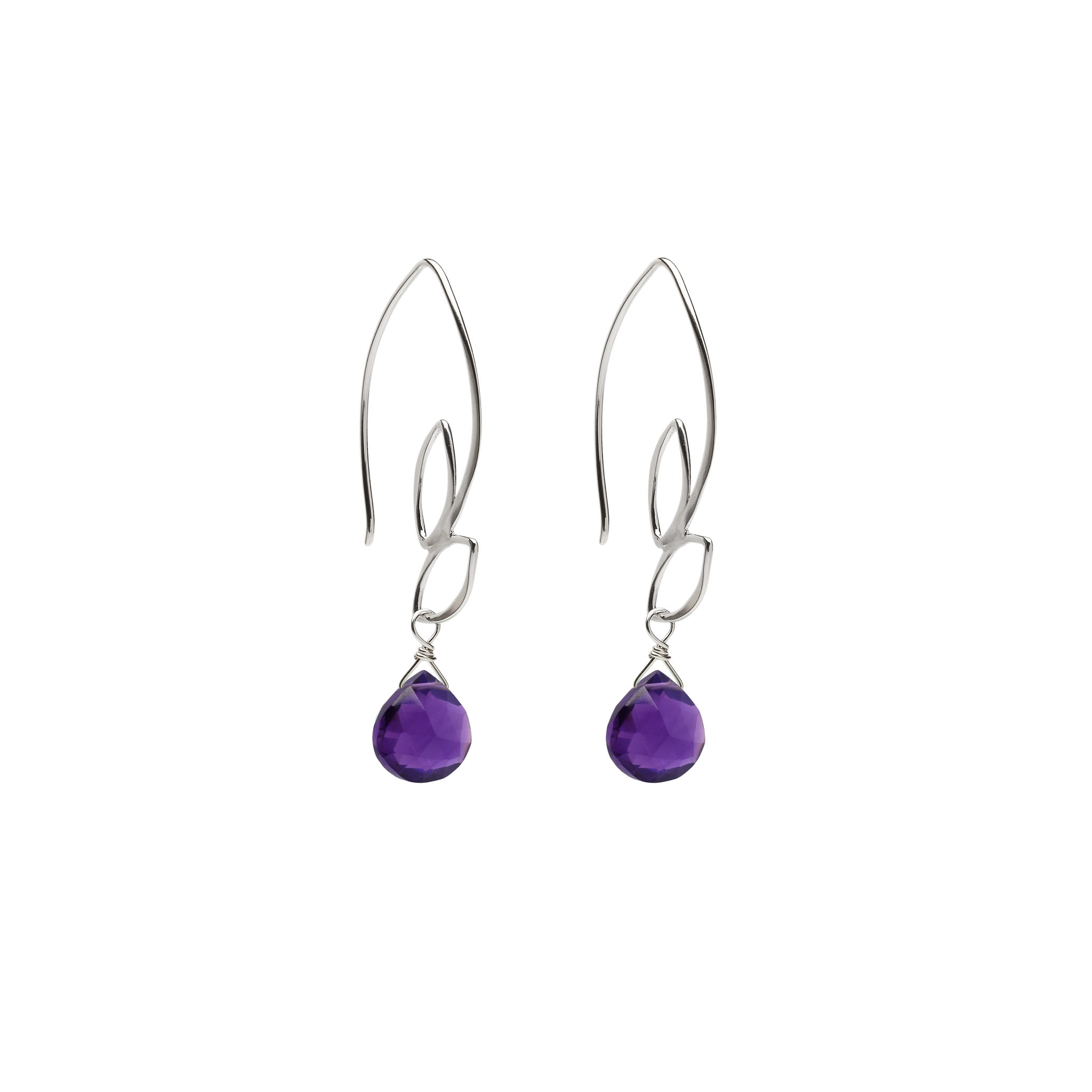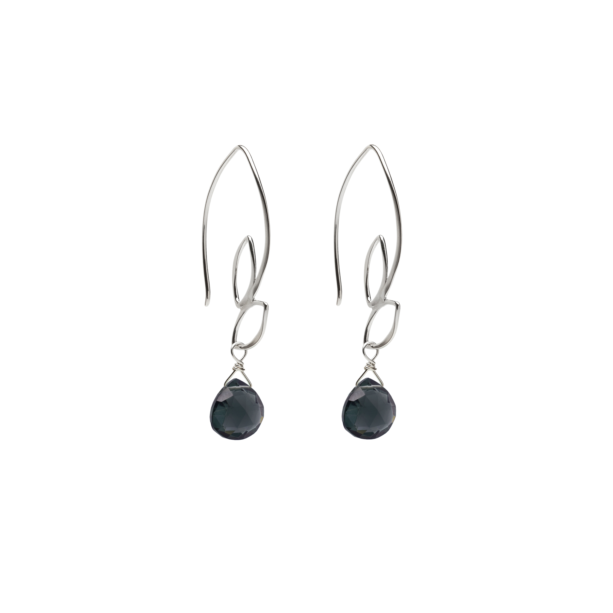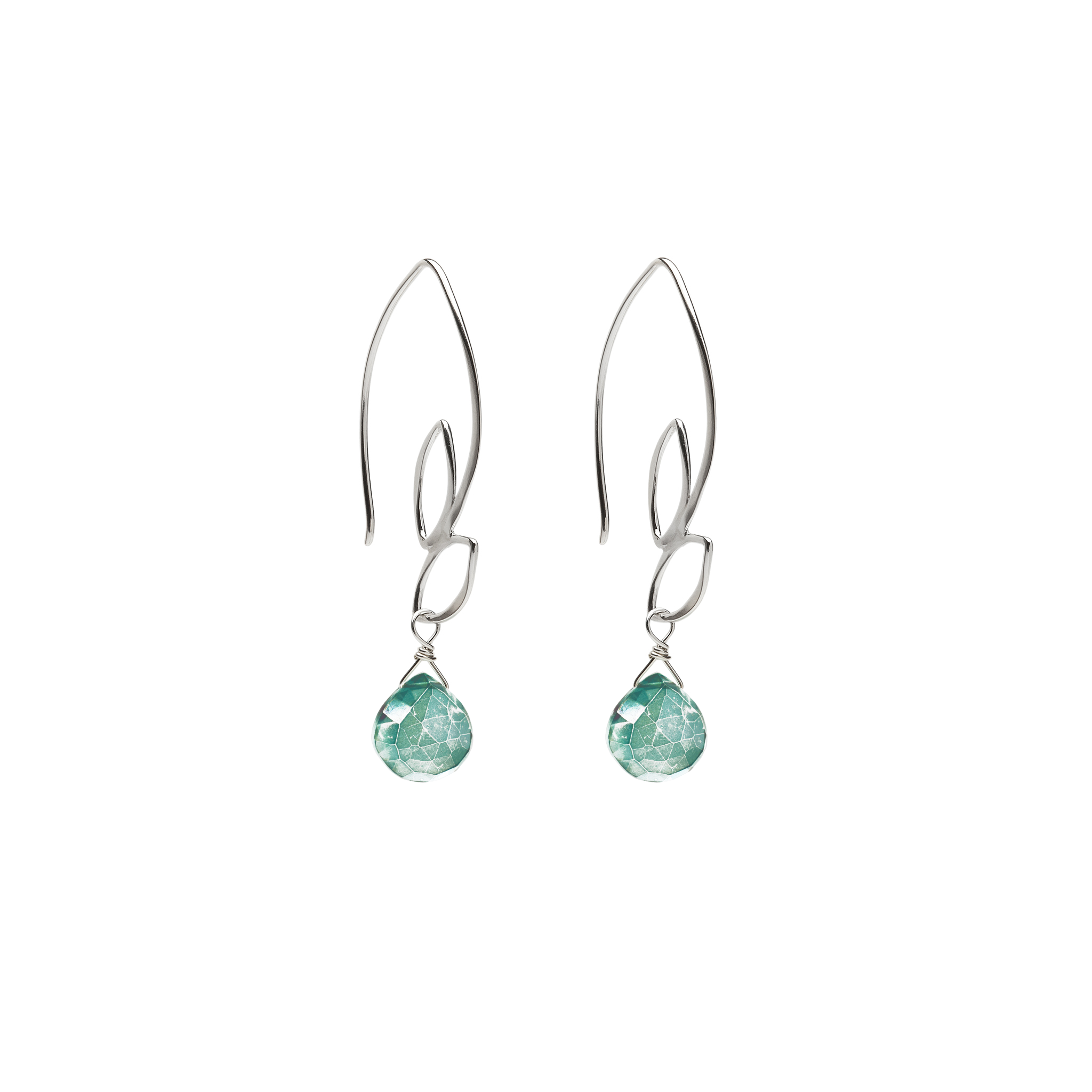 These open leaf hoop earrings are sterling silver, made with a minimum of 60% recycled silver. Semi-precious gemstones.