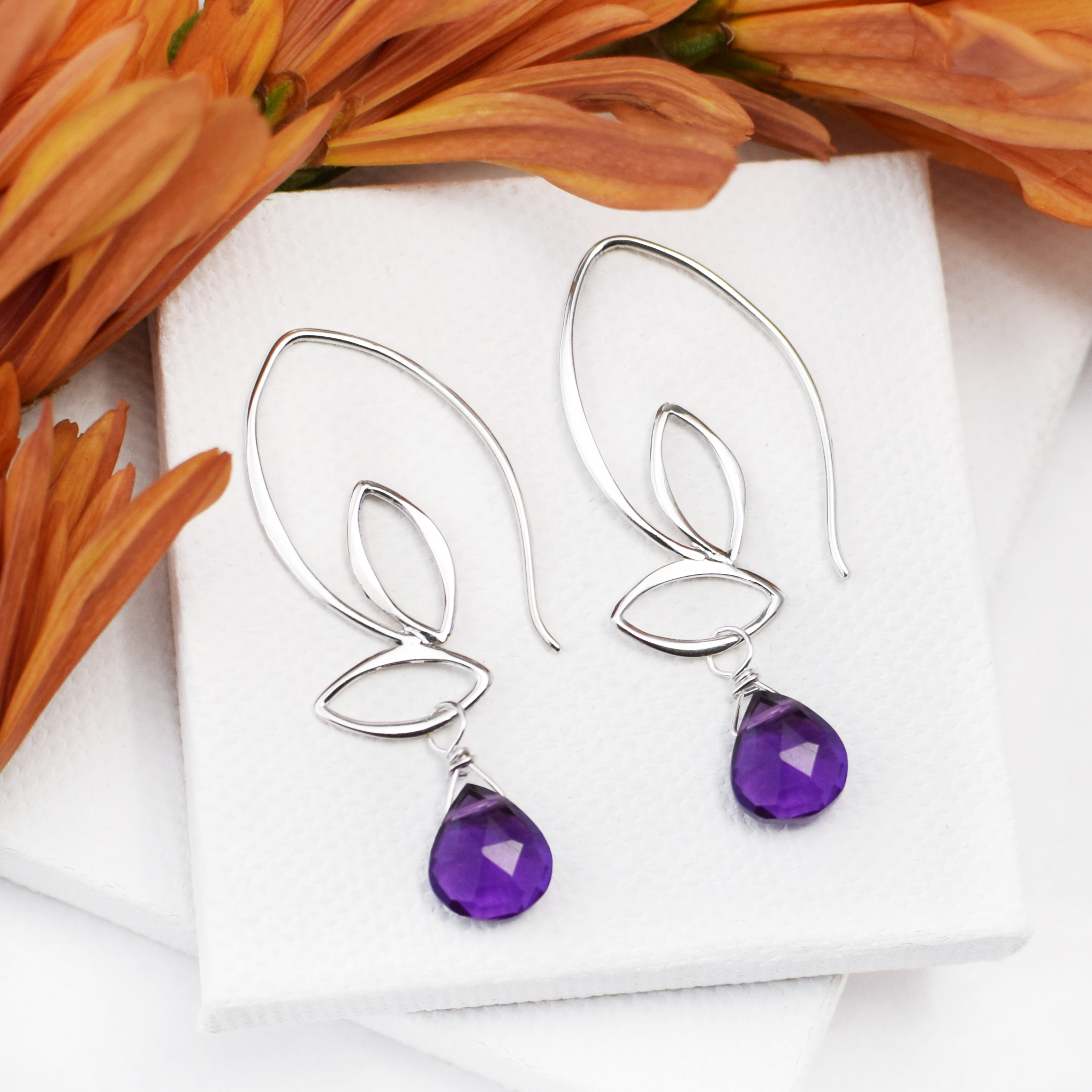 I'm super smitten with these open leaf hoop earrings (as well as the larger version!). I love the simple elegance of Ella Gem Earrings, but wanted hoops with my signature leaf design. These handmade leaf hoop earrings feature faceted gemstones dangling from sterling silver leaf hook earwires (both leaves are the same size).