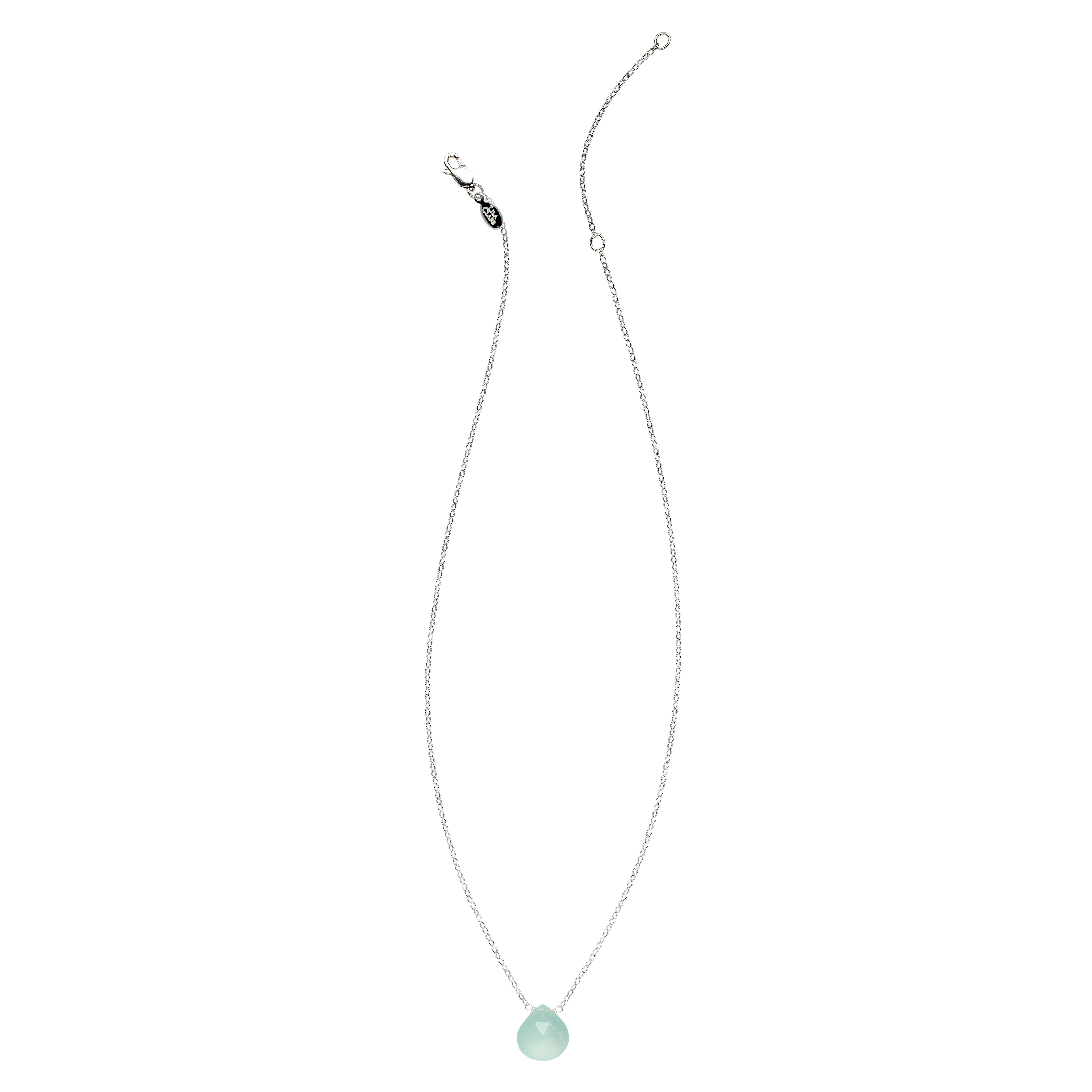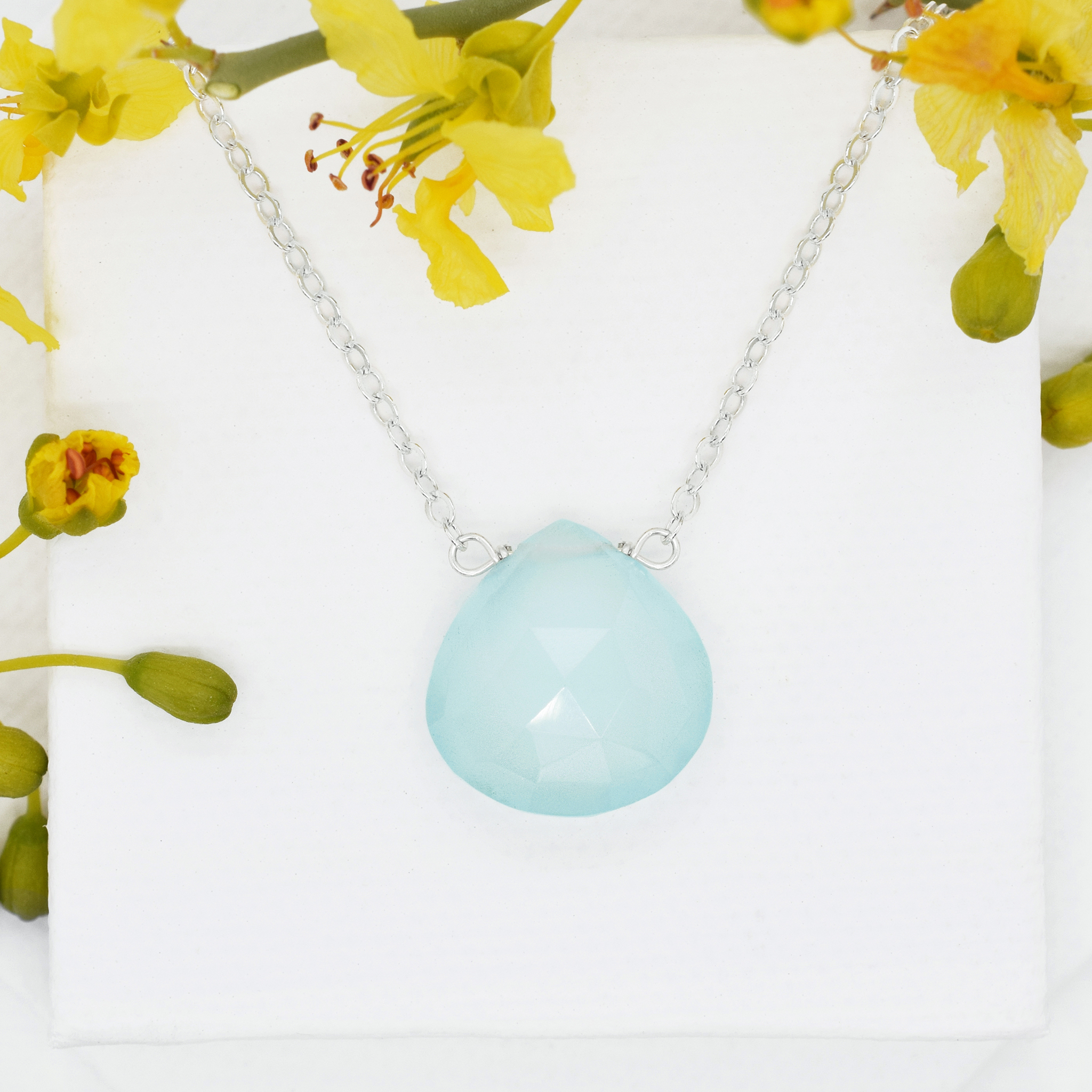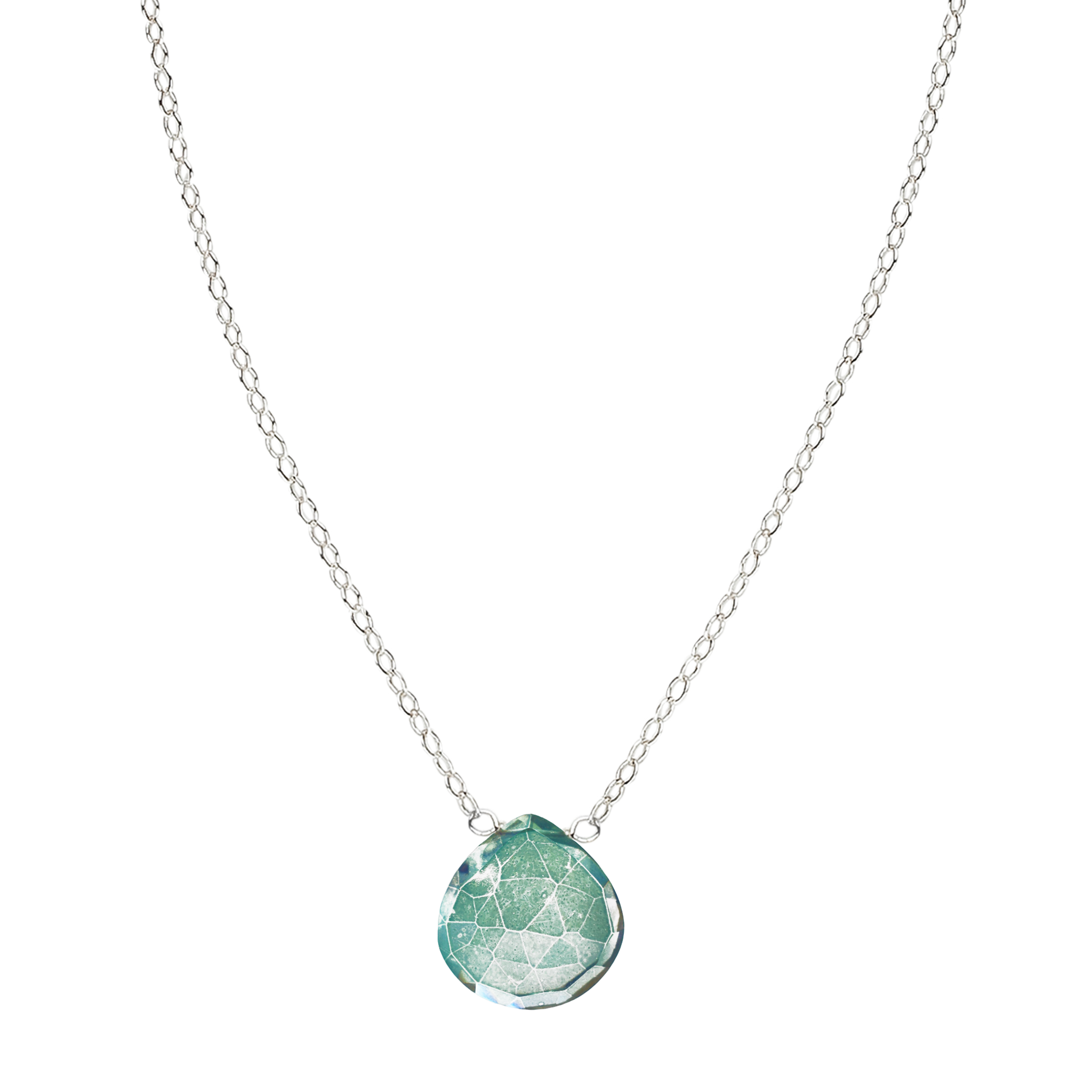 This silver and gemstone necklace features a faceted gemstone suspended in sterling silver chain.
