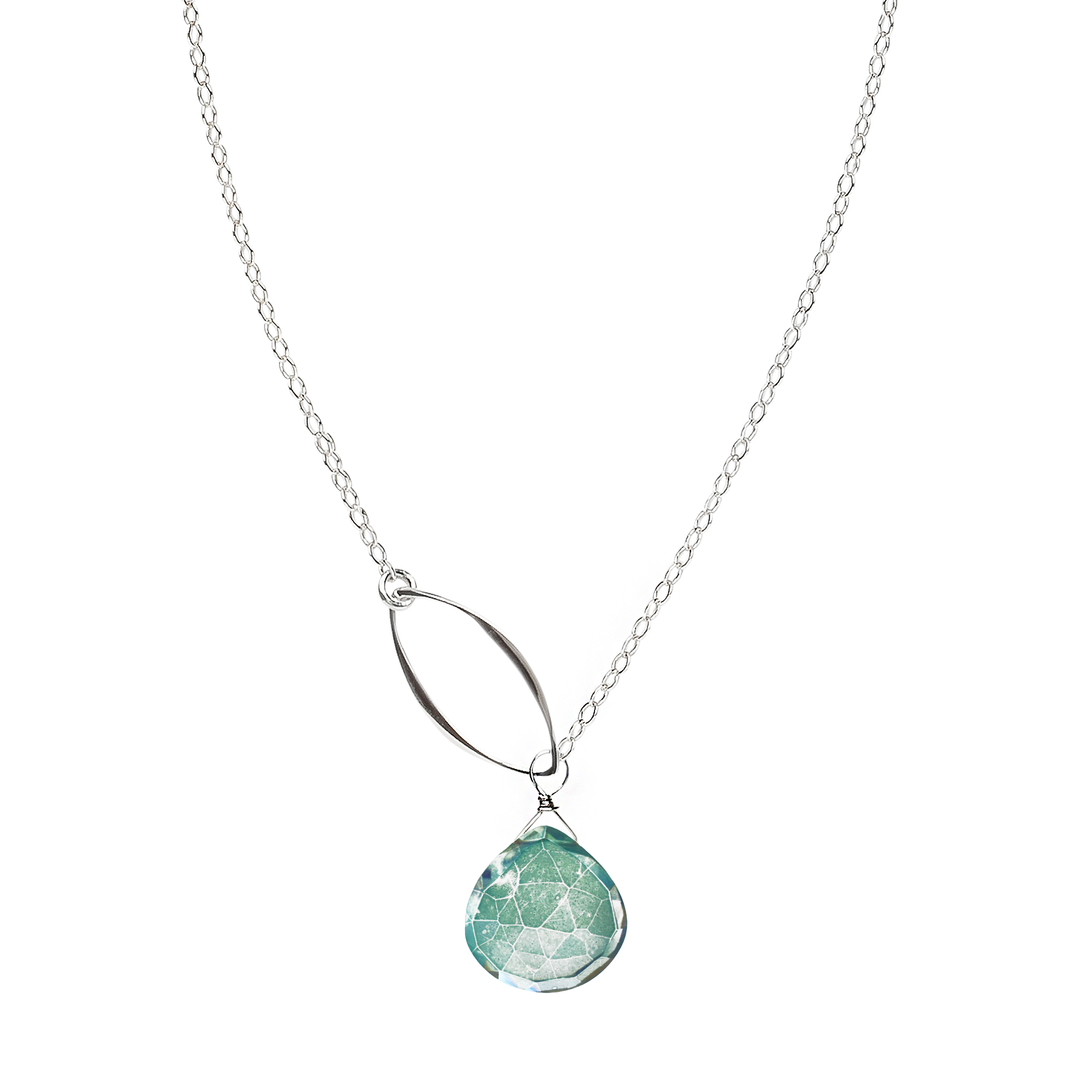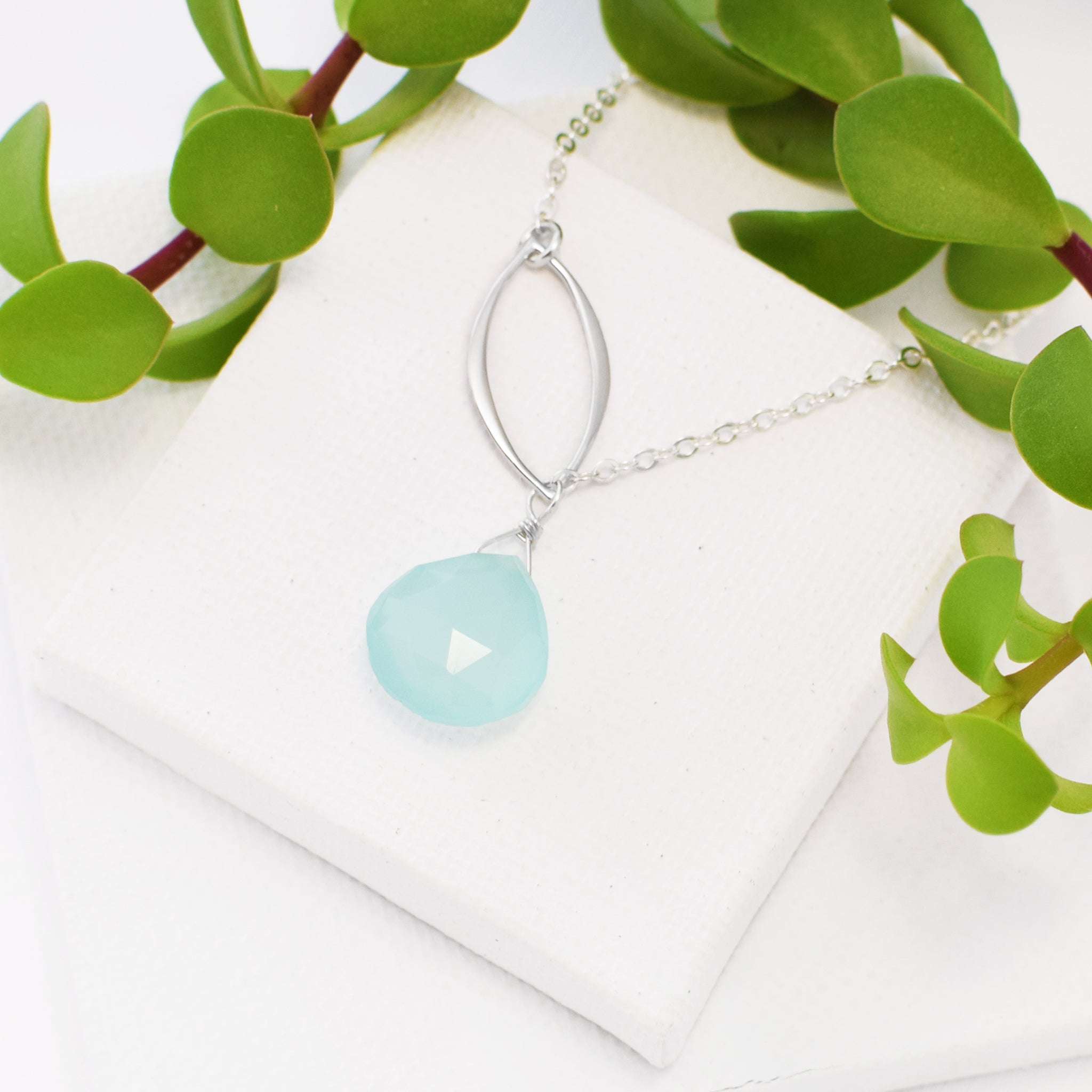I love this little gemstone necklace!! The opaque aqua stone is beautiful and the little leaf is so unique. The design is such that it always stays in place, not like others where the clasp ends up migrating to the front.