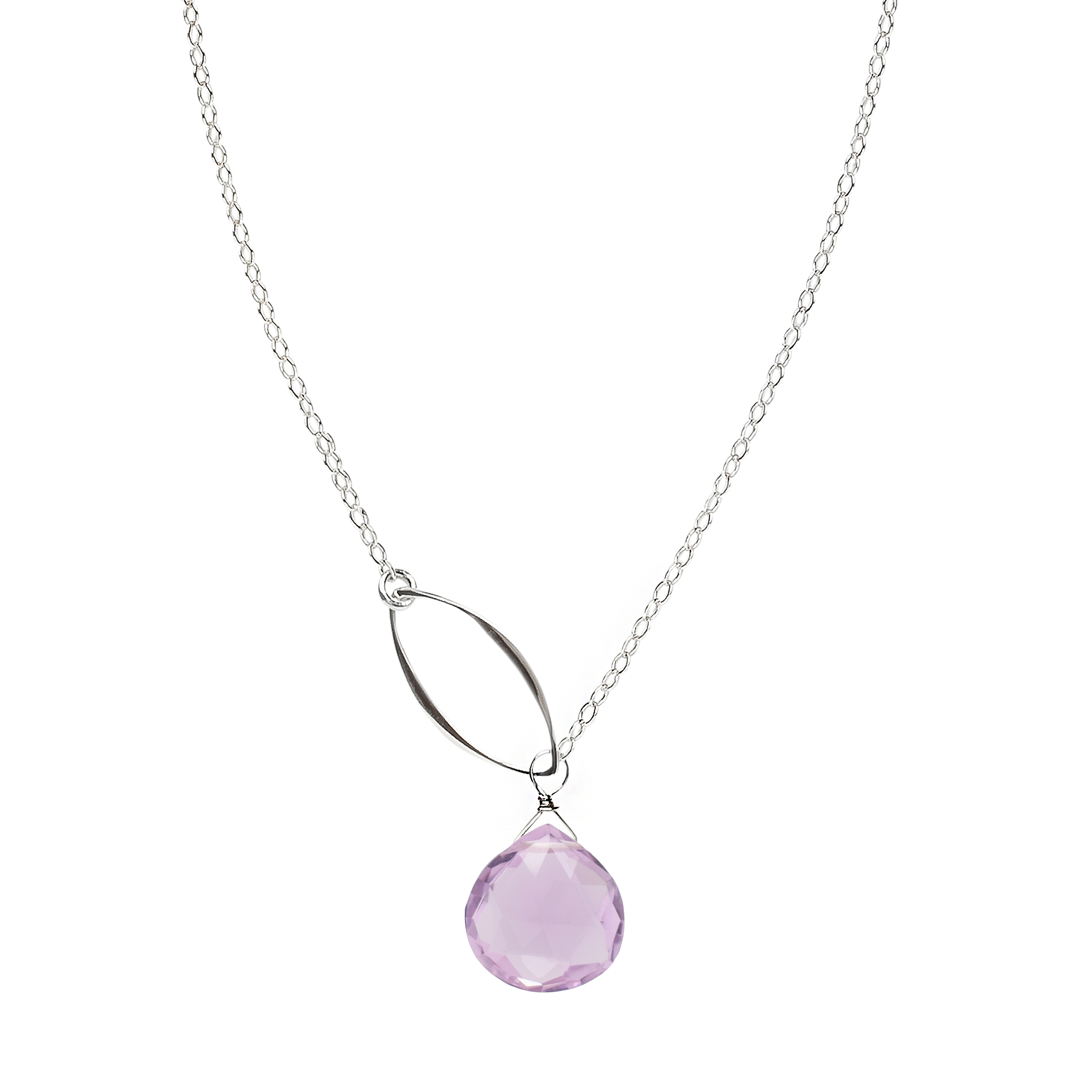 This handmade necklace features a faceted gemstone suspended from a sterling silver open leaf focal.