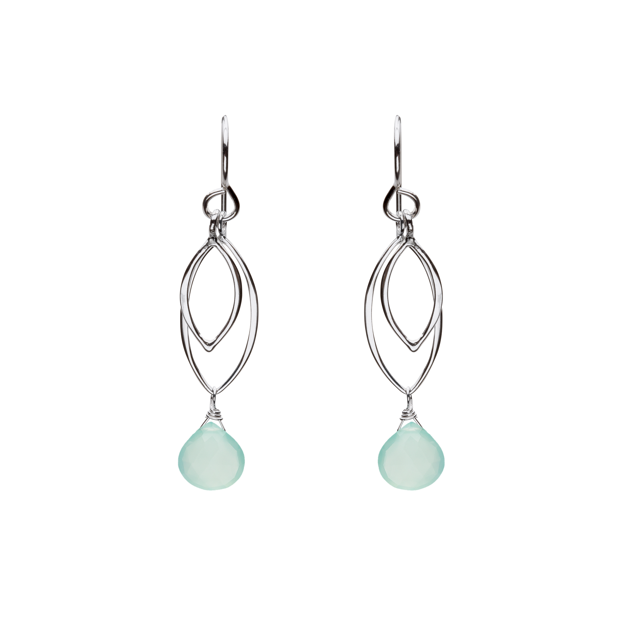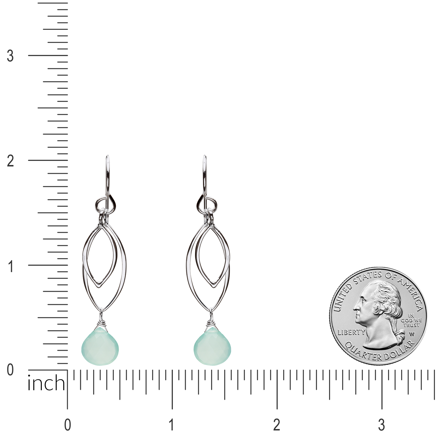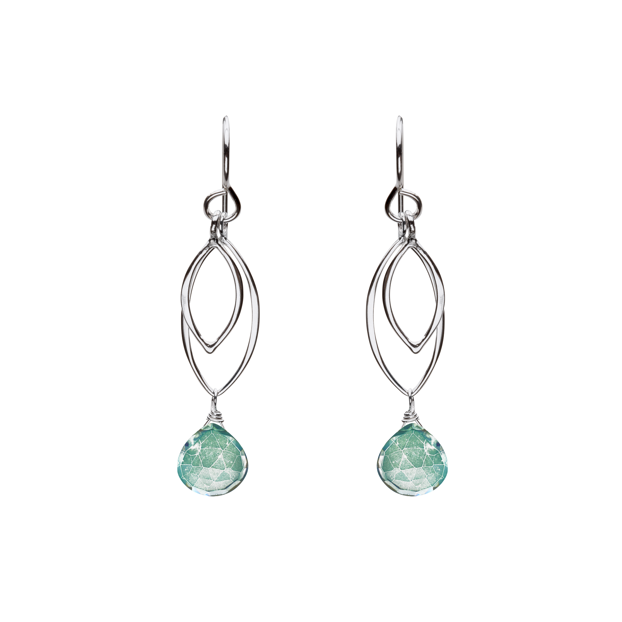 These dangling silver leaf earrings are solid sterling silver, made with a minimum of 60% recycled silver. Semi-precious gemstones.