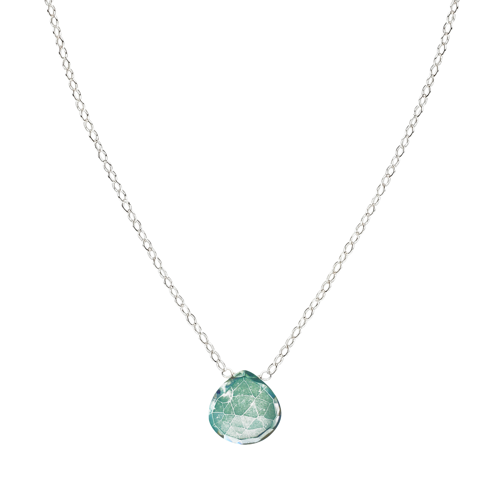 This silver and gemstone necklace features a faceted gemstone suspended within sterling silver chain.
