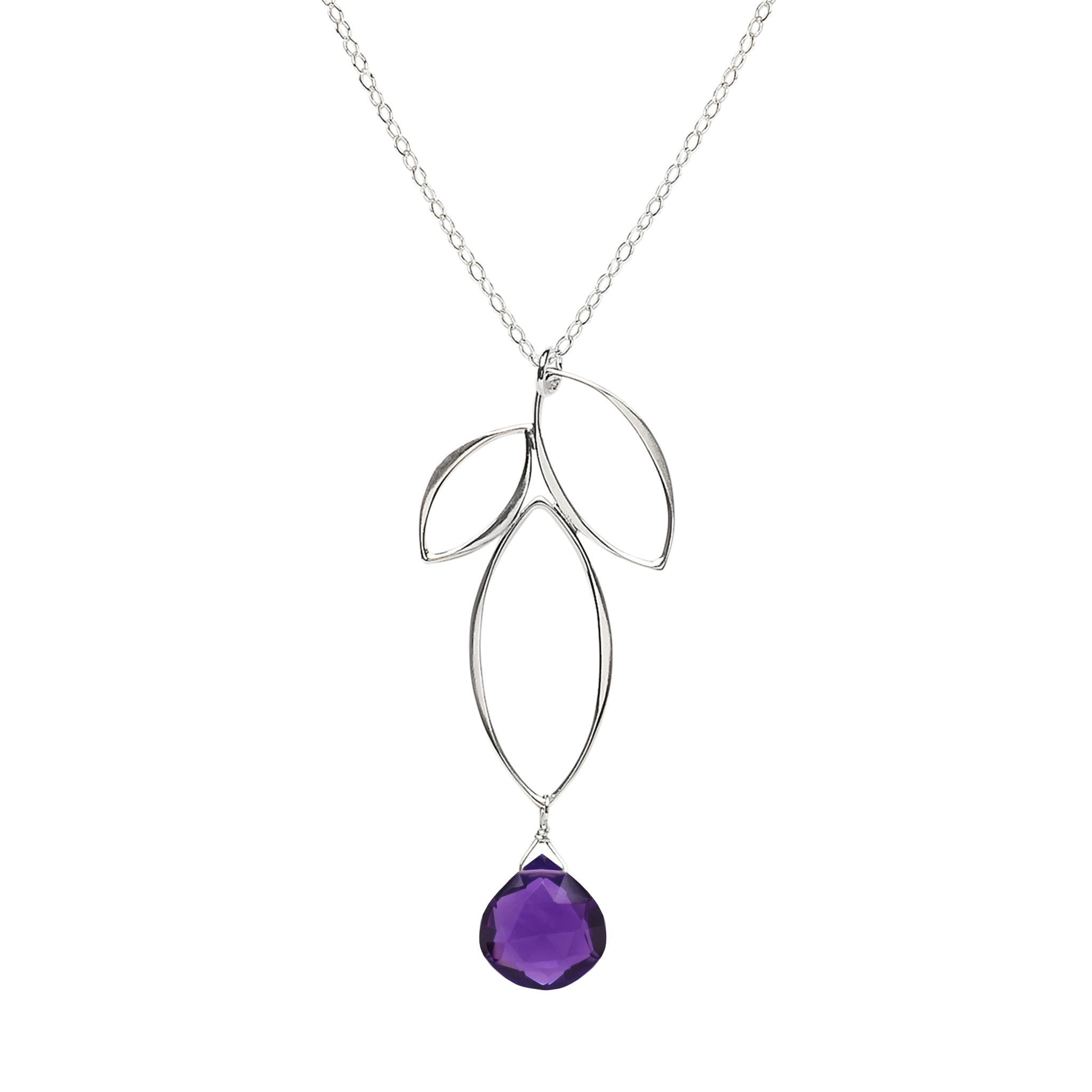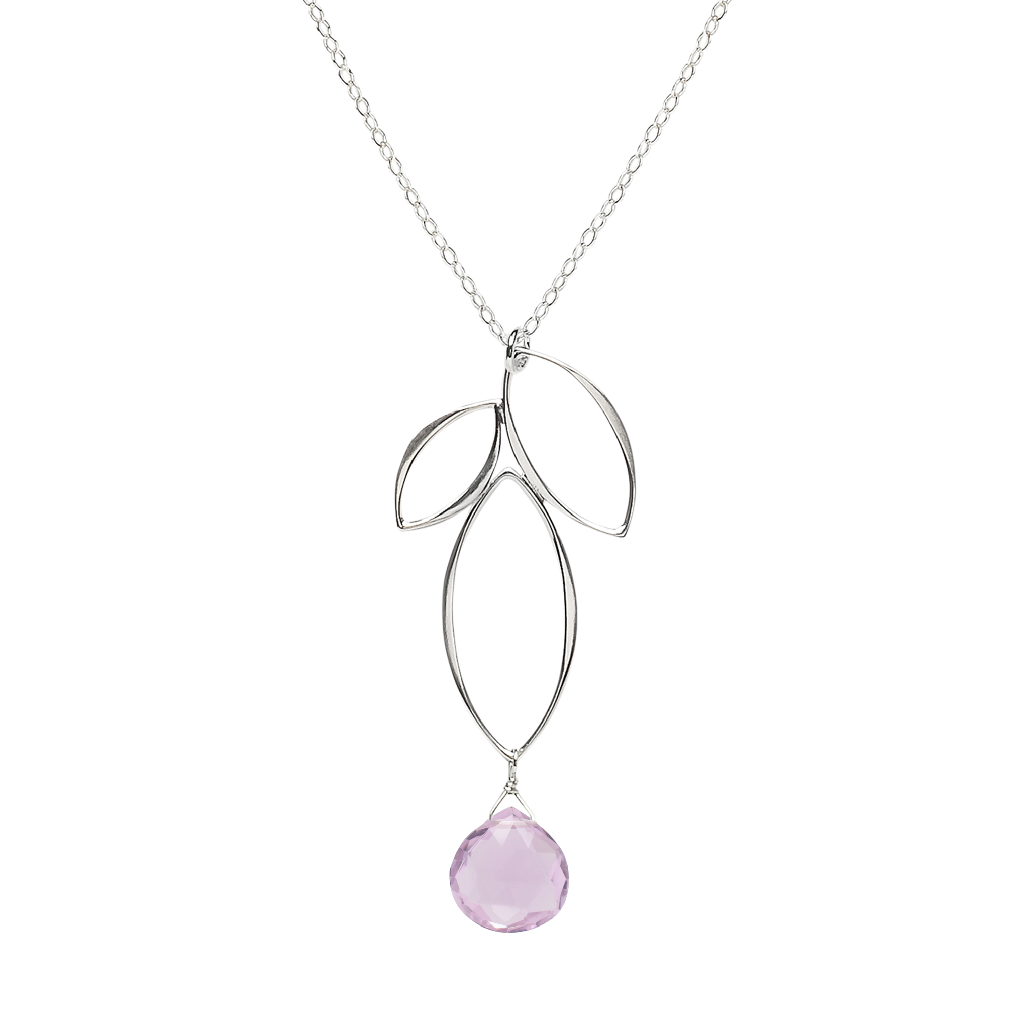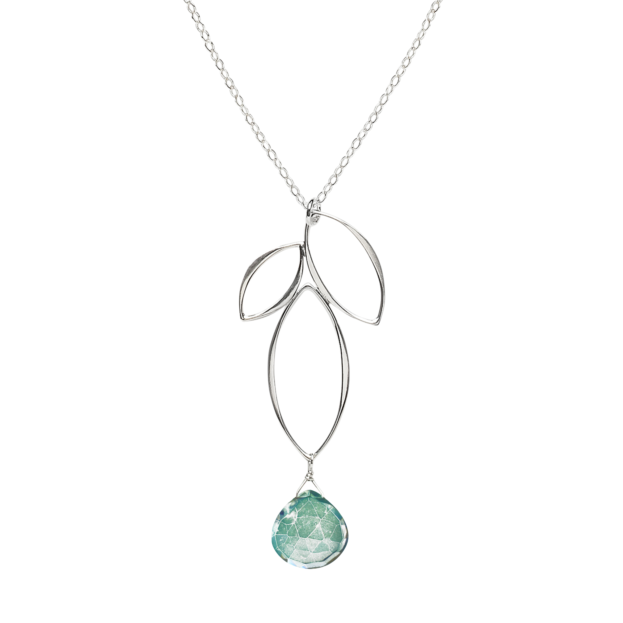 This necklace features a faceted gemstone dangling from a sterling silver open flower pendant.
