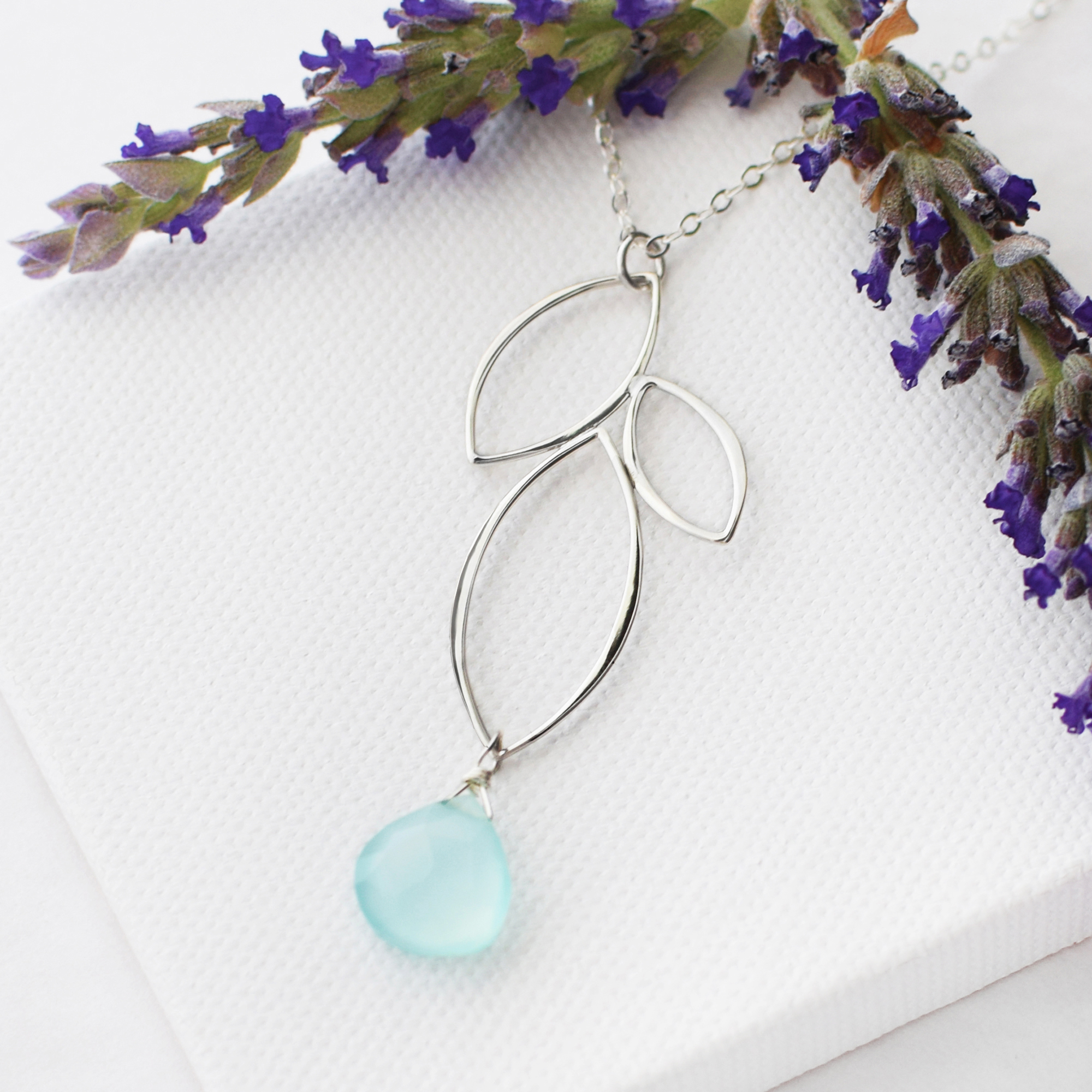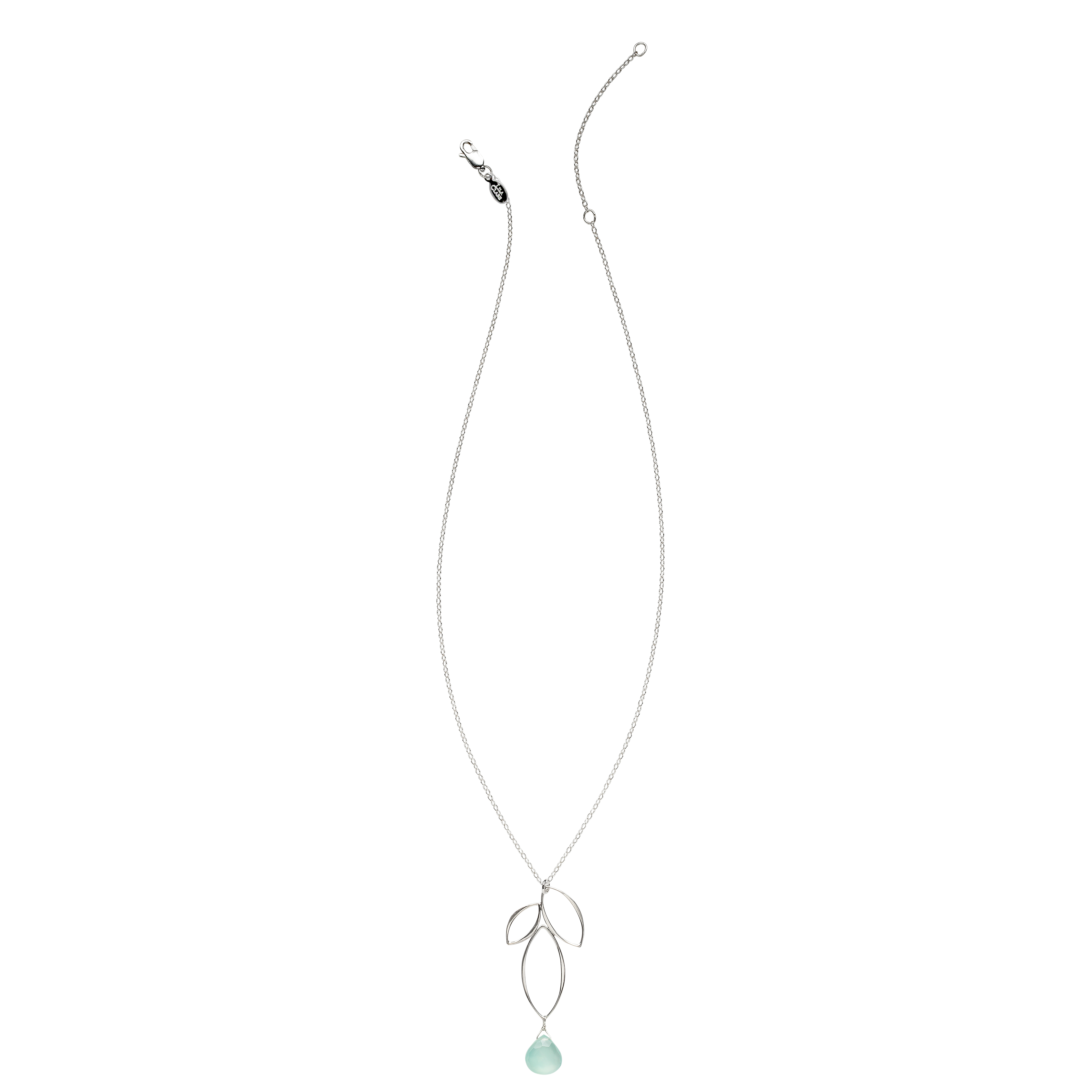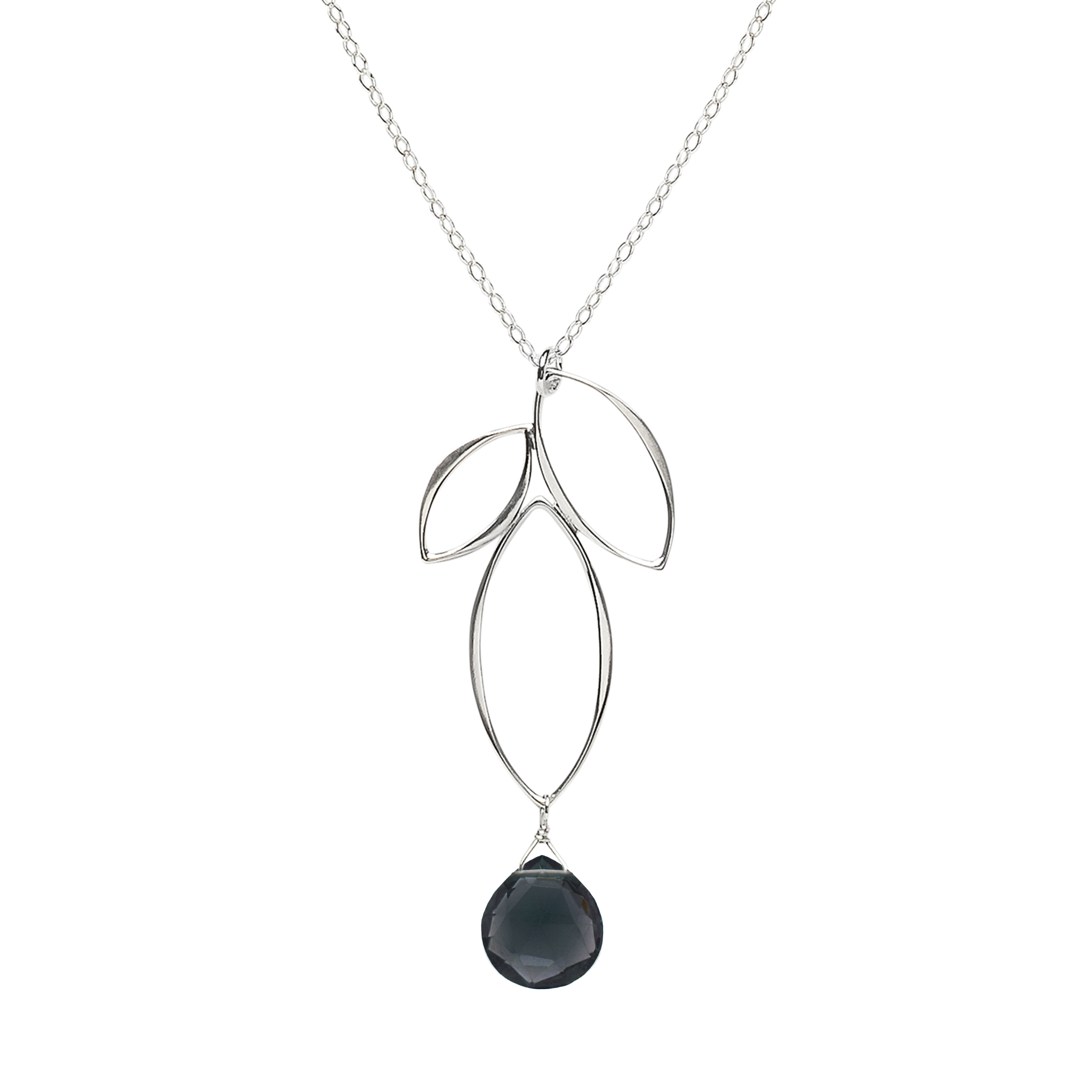 This necklace features a faceted gemstone dangling from a sterling silver open flower pendant.