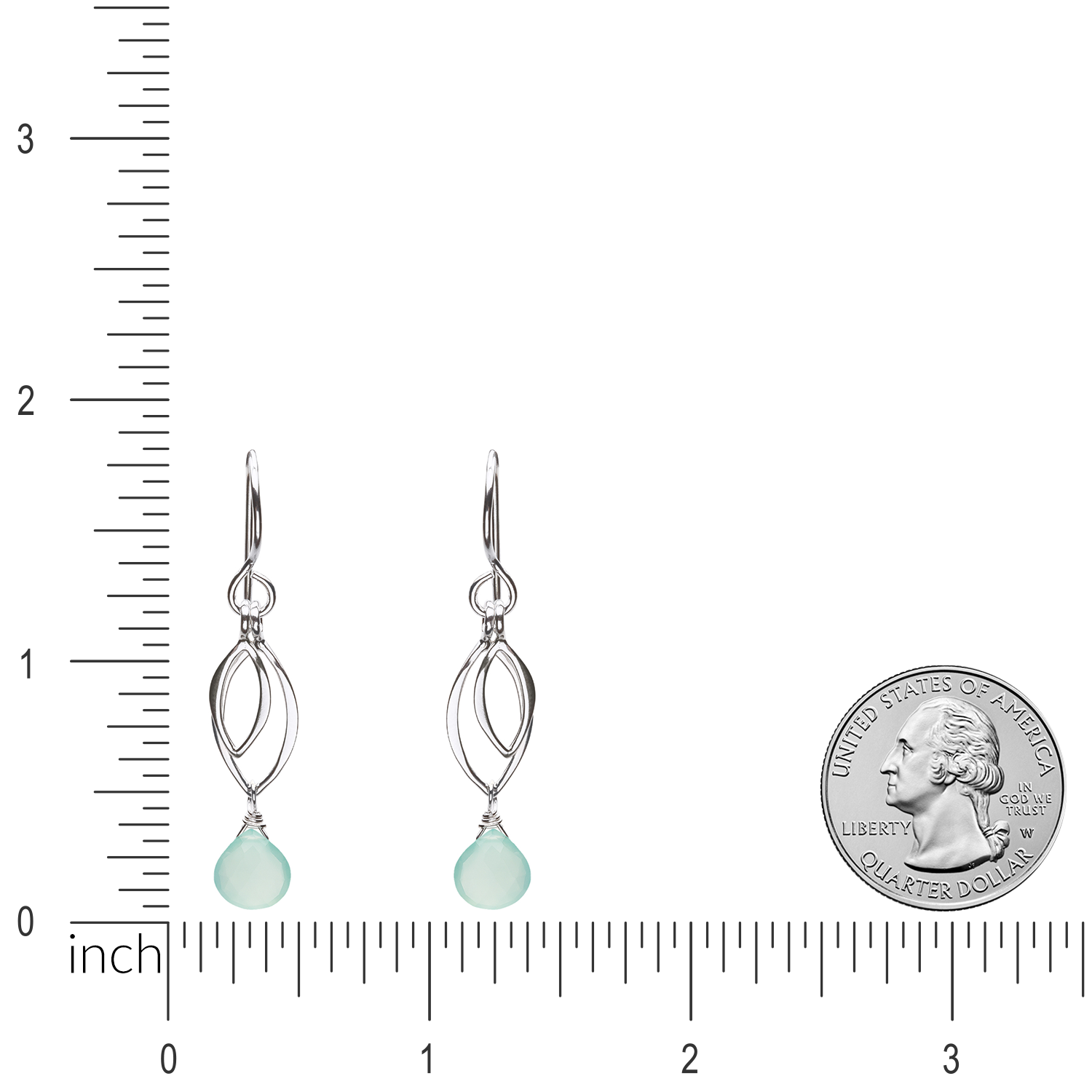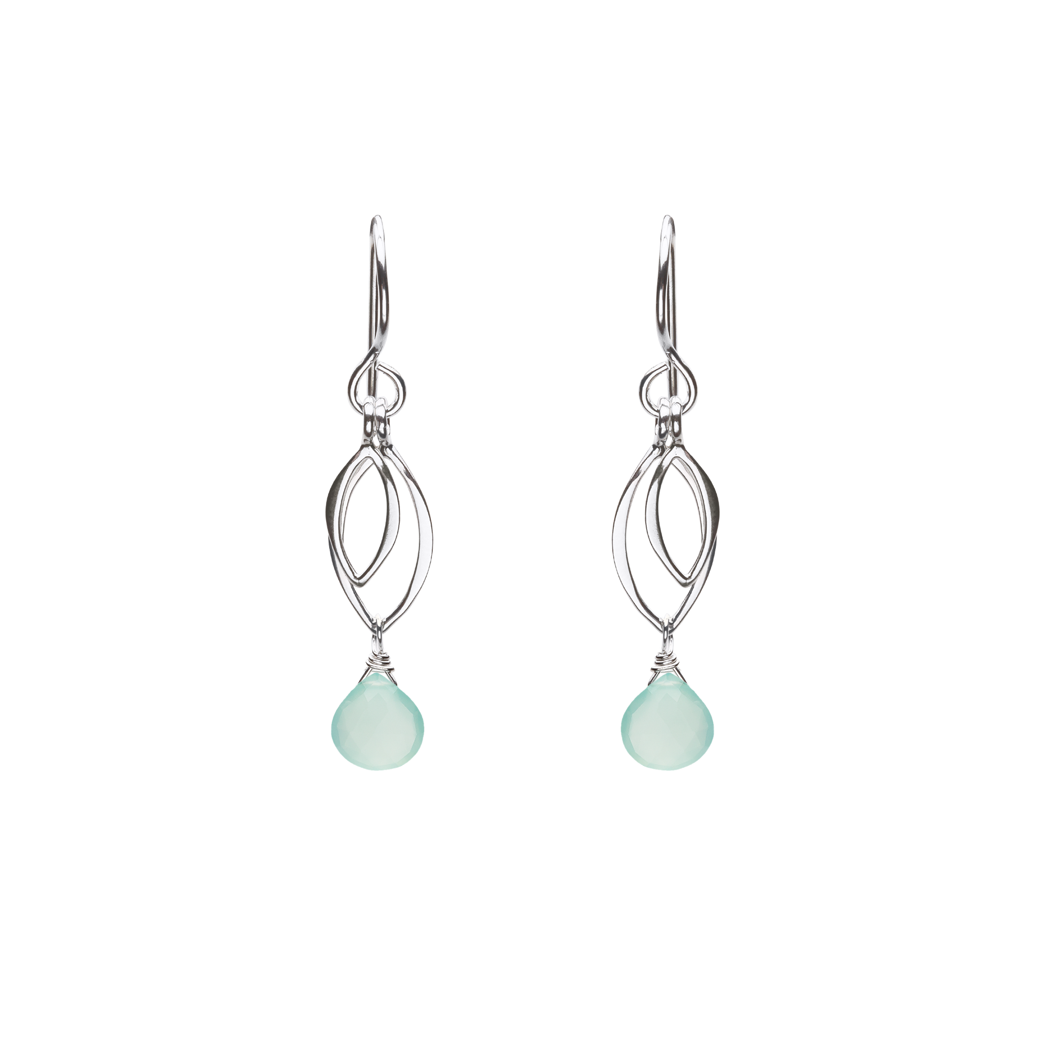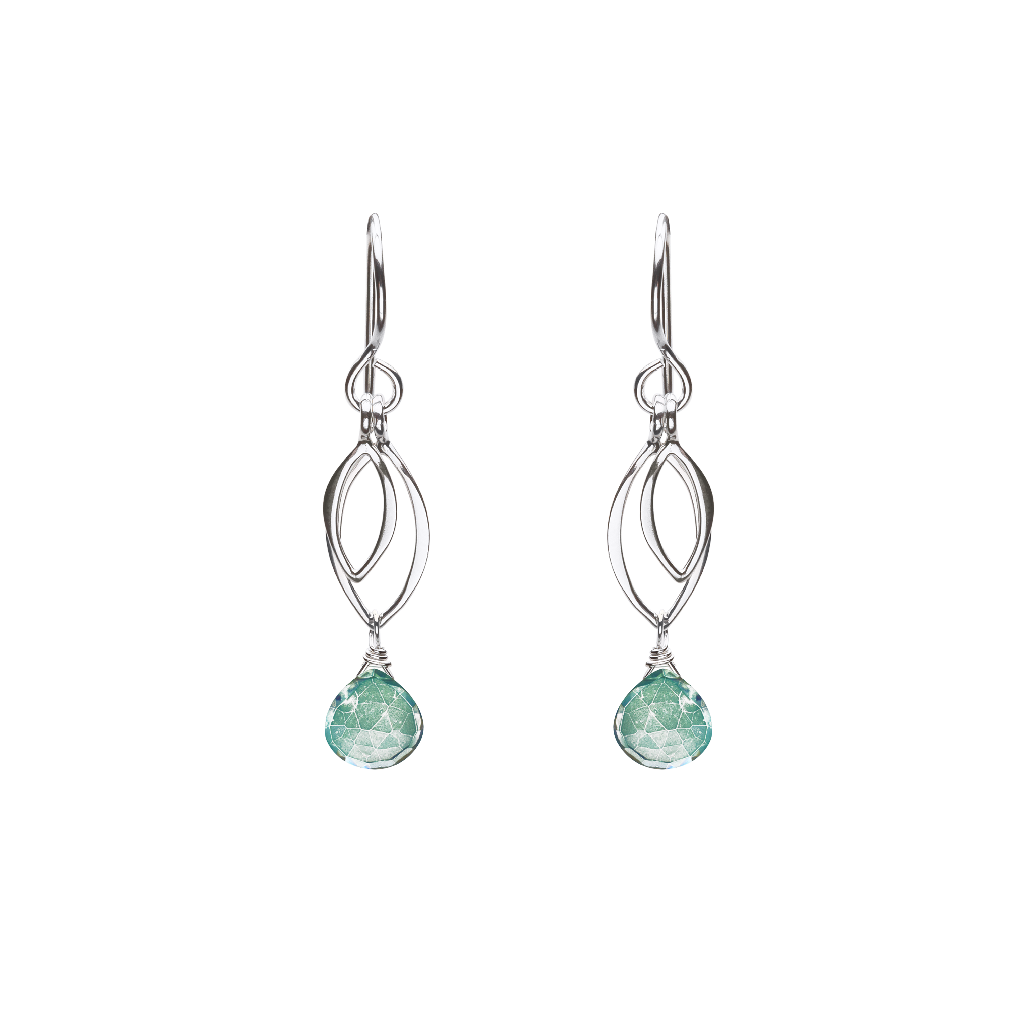 These dangling silver leaf earrings are sterling silver, made with a minimum of 60% recycled silver. Semi-precious gemstones.