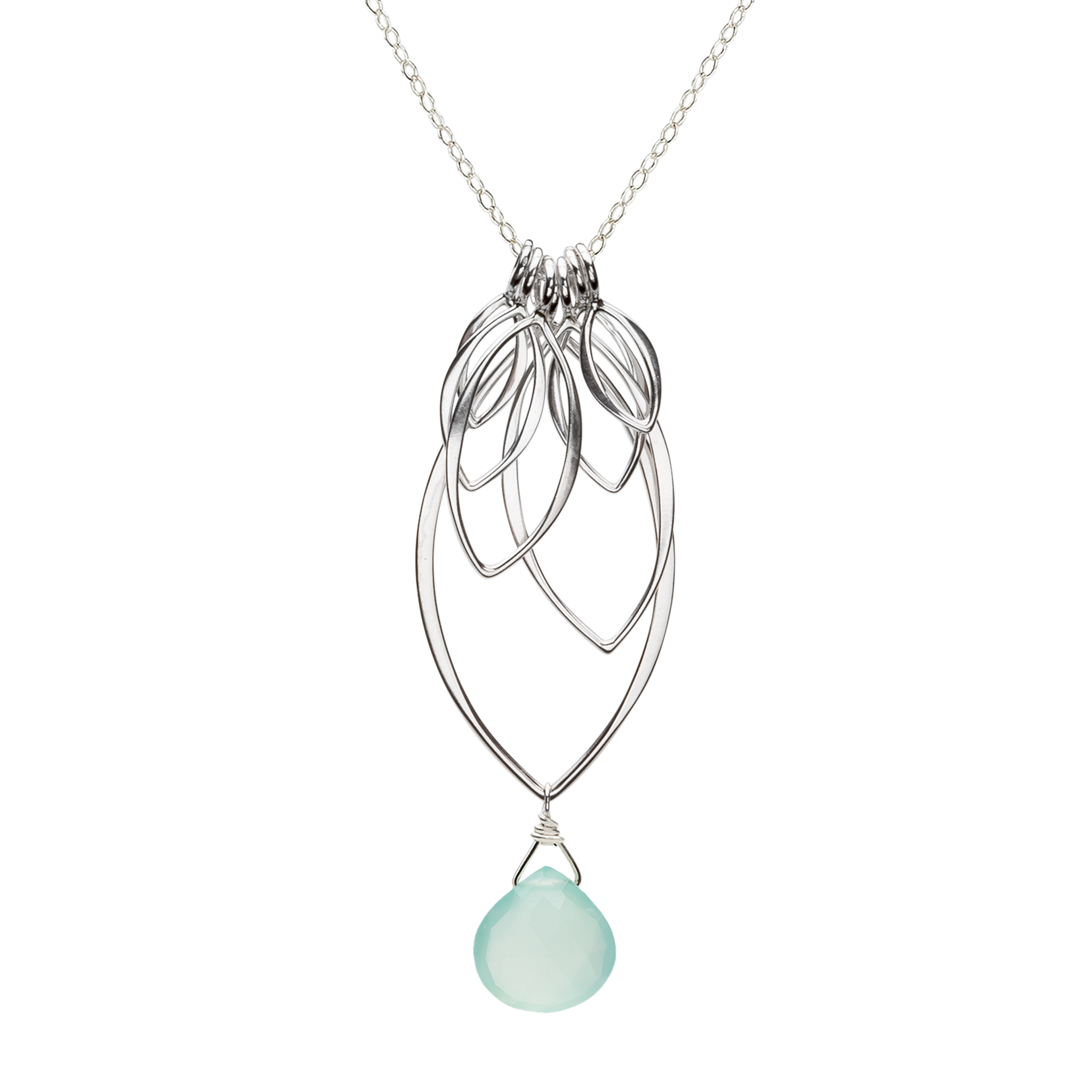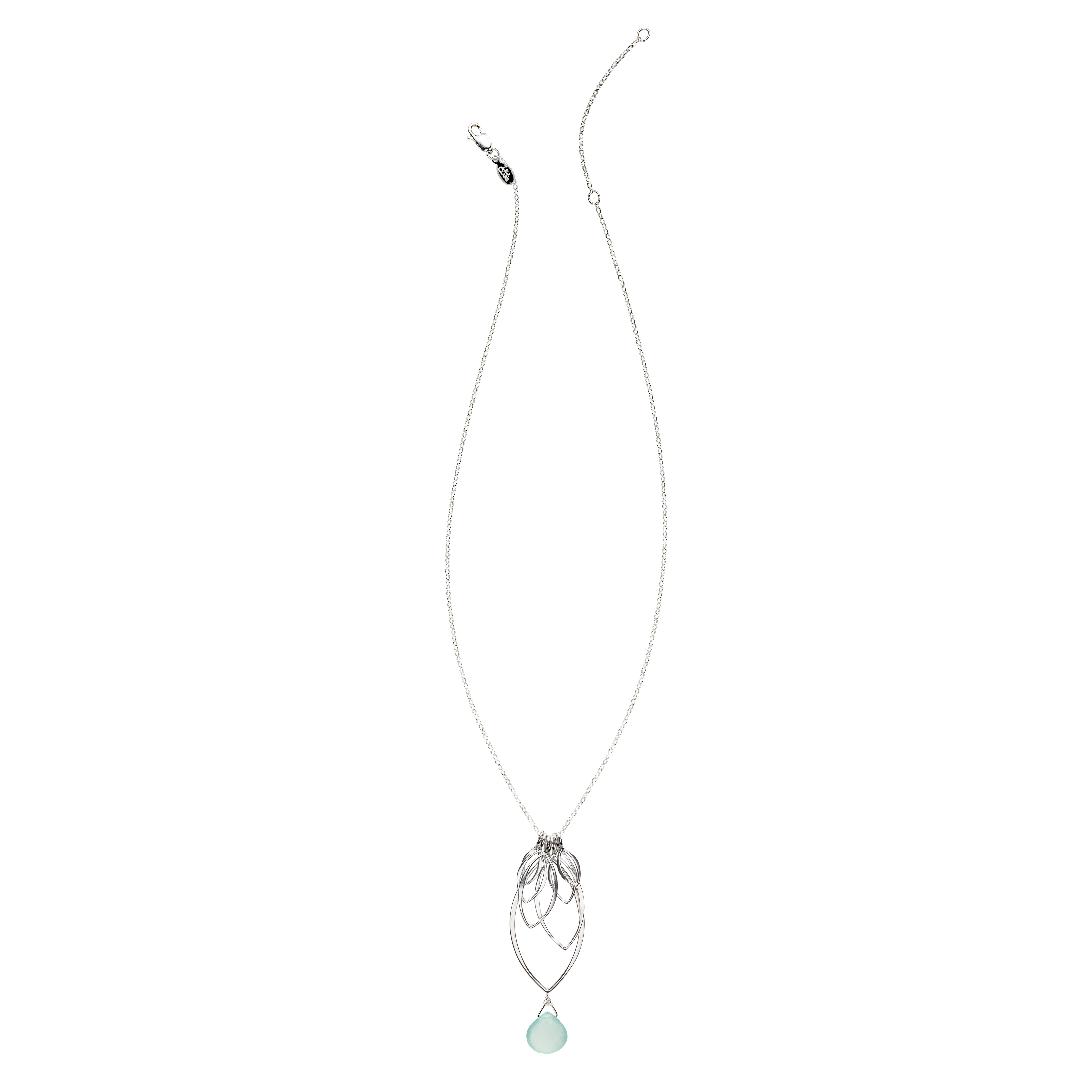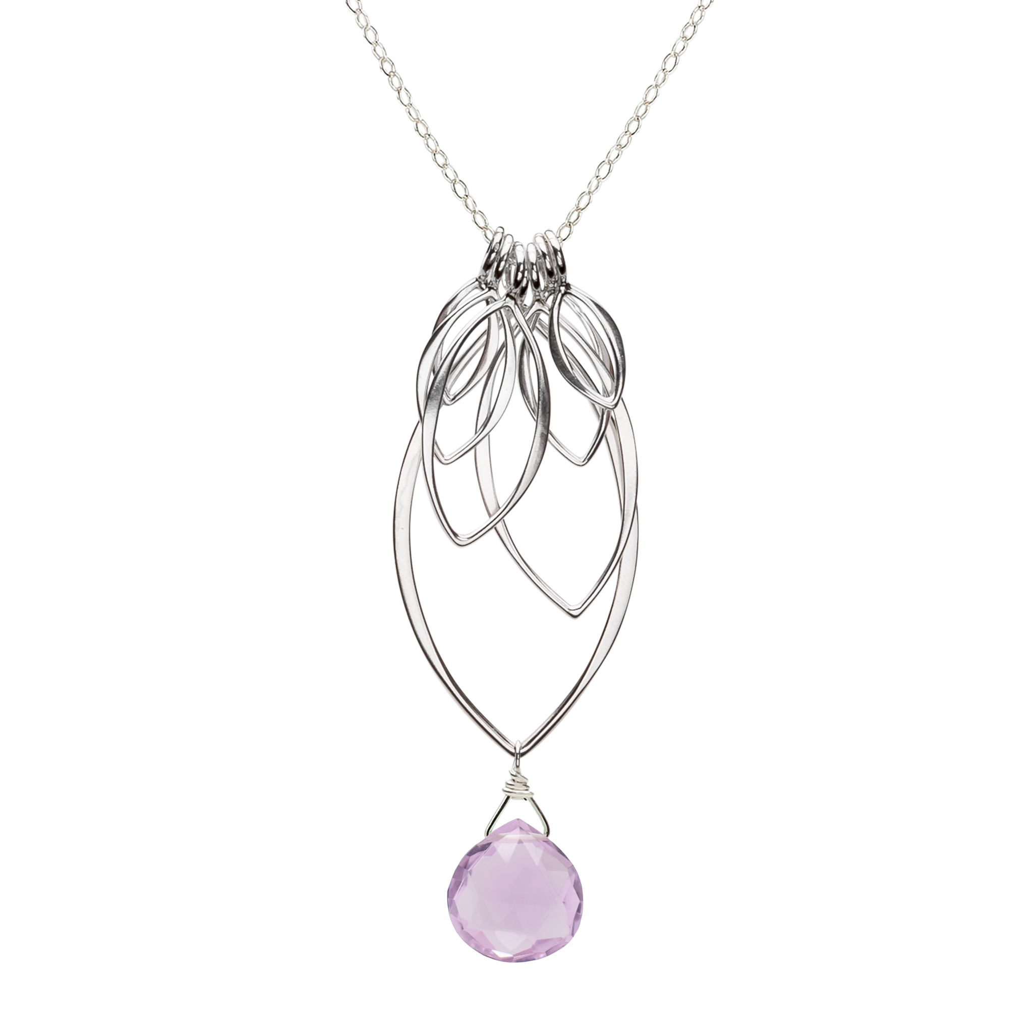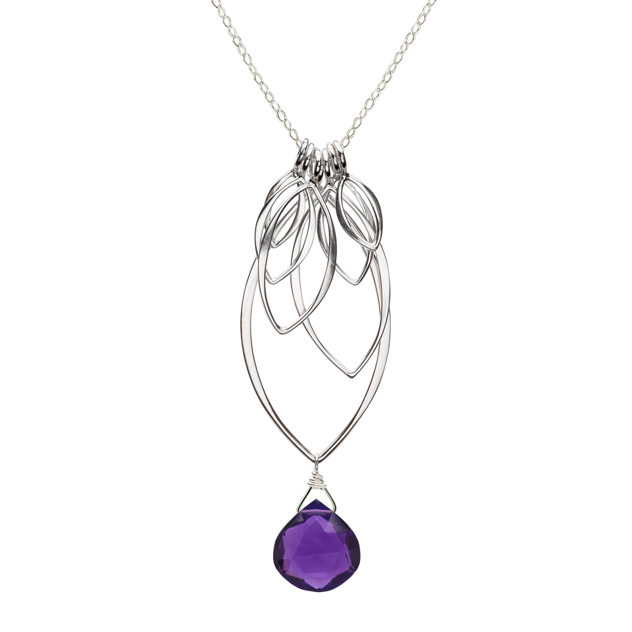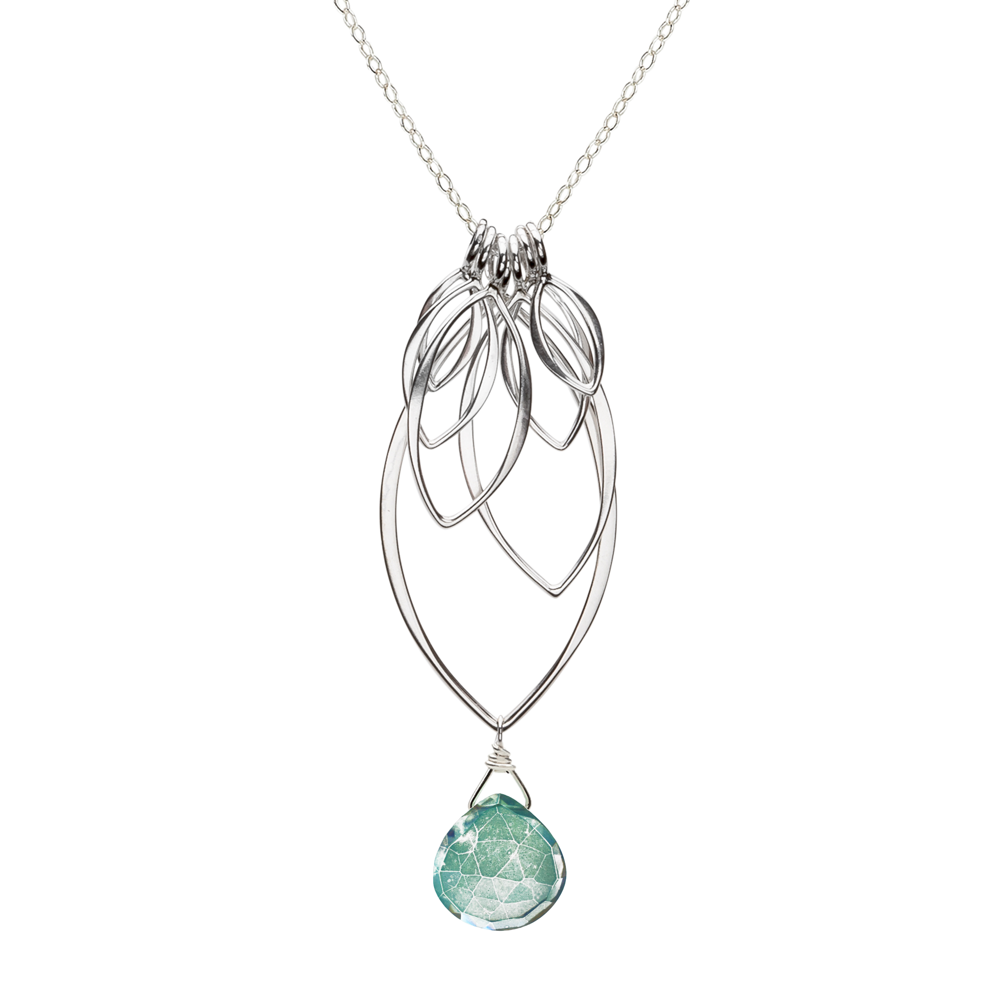 This multi leaf dangle pendant is solid sterling silver, with sterling silver, made with a minimum of 60% recycled silver. Sterling silver chain and clasp. Semi-precious gemstones.