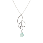 Image of silver four leaf necklace with aqua chalcedony gemstone on white blocks with brown plant.