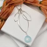 This handmade necklace features three dangling sterling silver leaves; a faceted semi-precious gemstone is suspended from the center largest leaf.