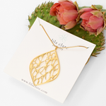 Eco-friendly botanical necklace. The solid gold pendant is made with 100% recycled 14k gold. Recycled metals are sourced from a certified responsible refiner.