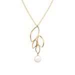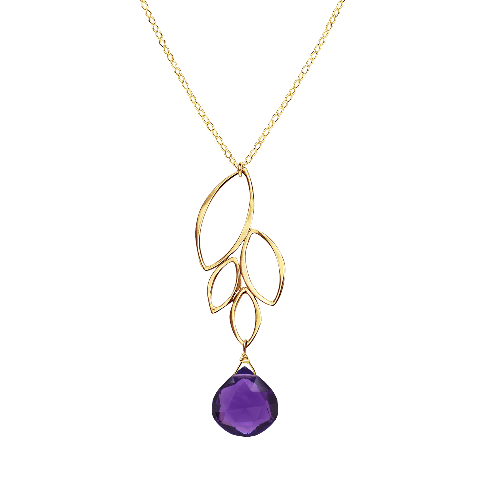 This handmade gold open leaf pendant is inspired by a fresh batch of leaves clustered at the end of a branch. A semi-precious gemstone dangles from the four leaf cluster pendant like a raindrop about to fall.