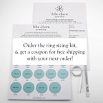 - A card with instructions on one side, and a ring size chart for measuring existing rings on the other side.